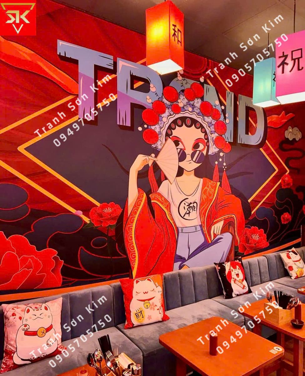 Tranh 3D cô gái trong trang phục truyền thống, không gian quán ăn đậm chất Á Đông