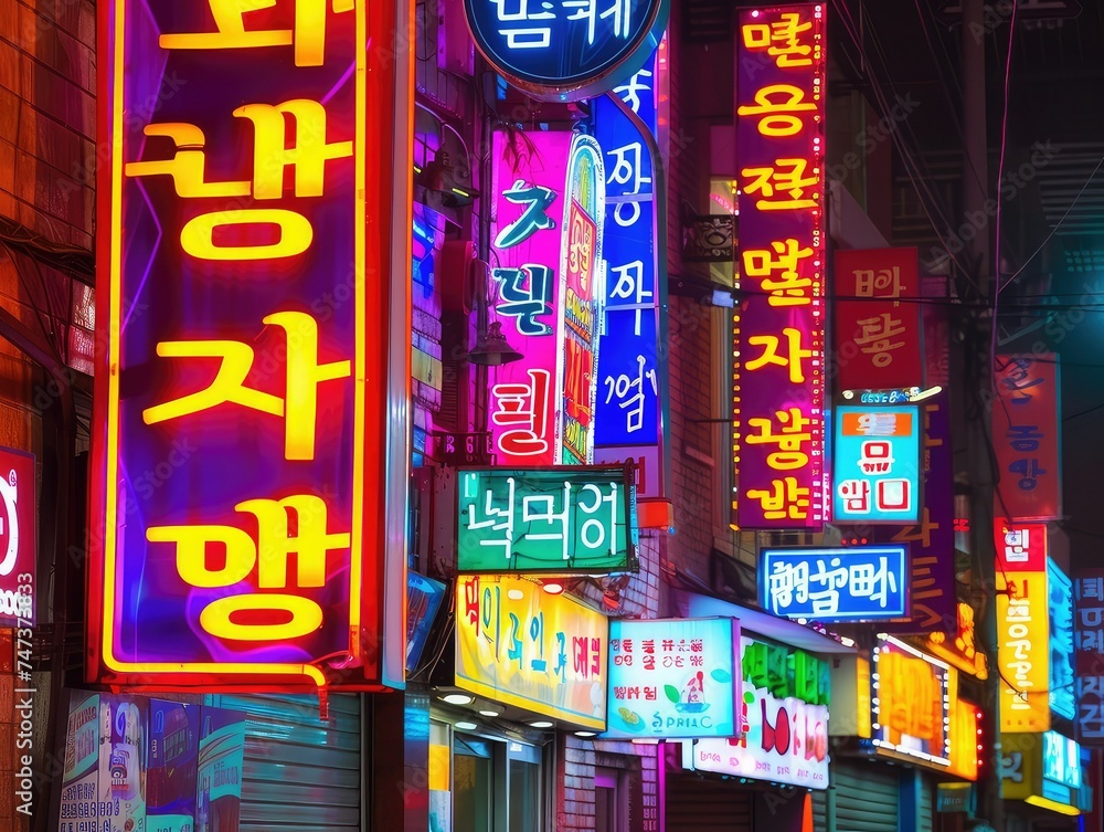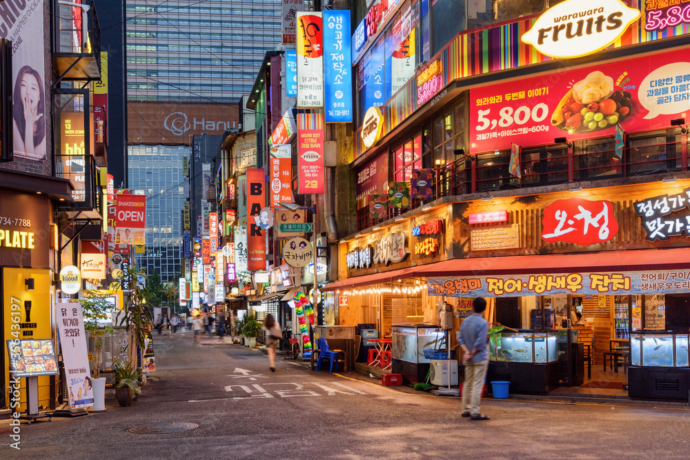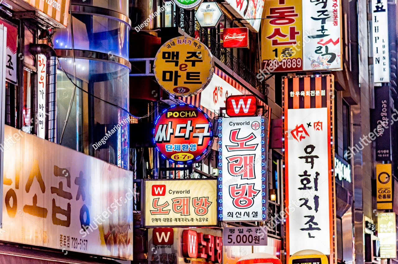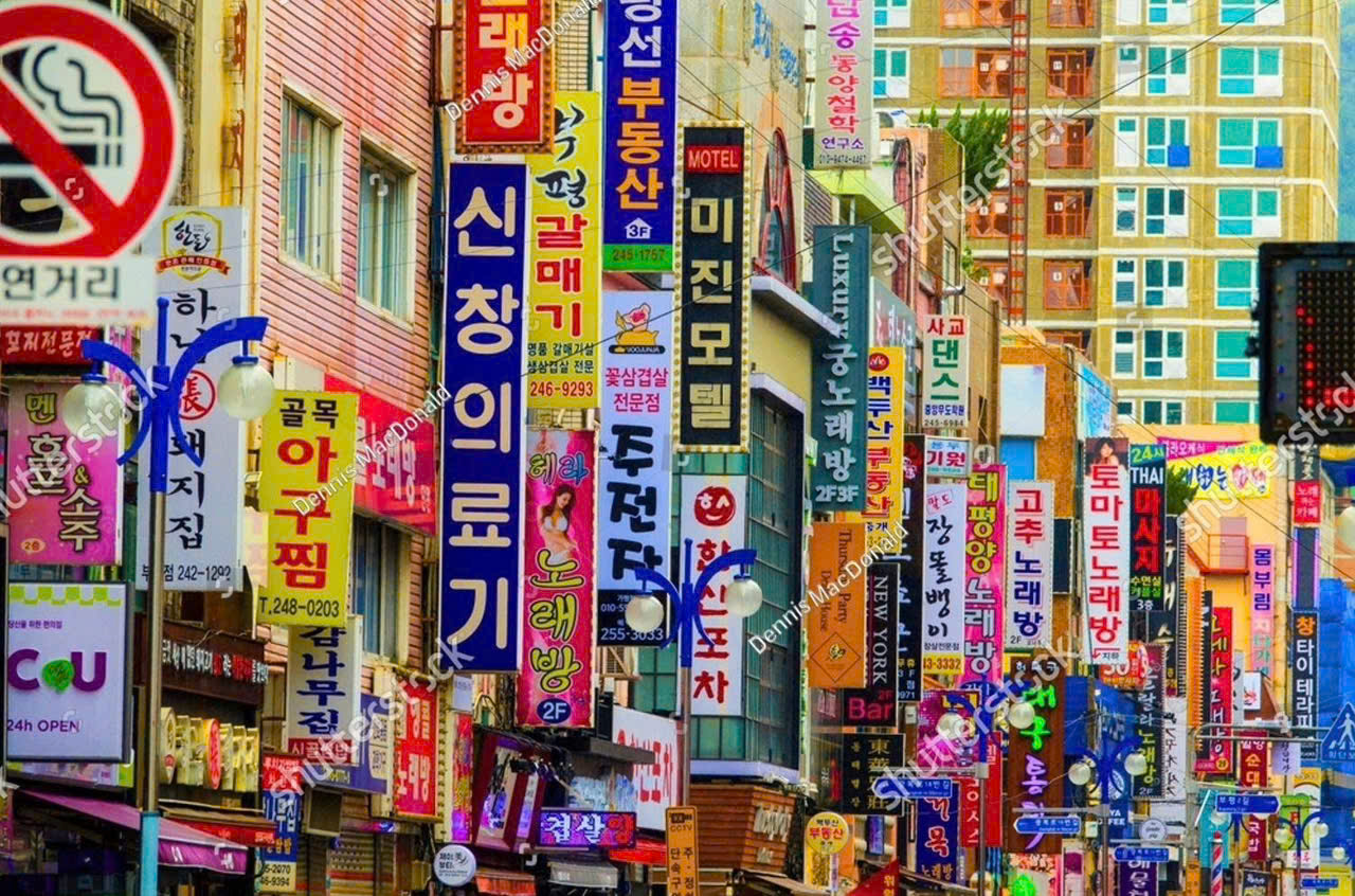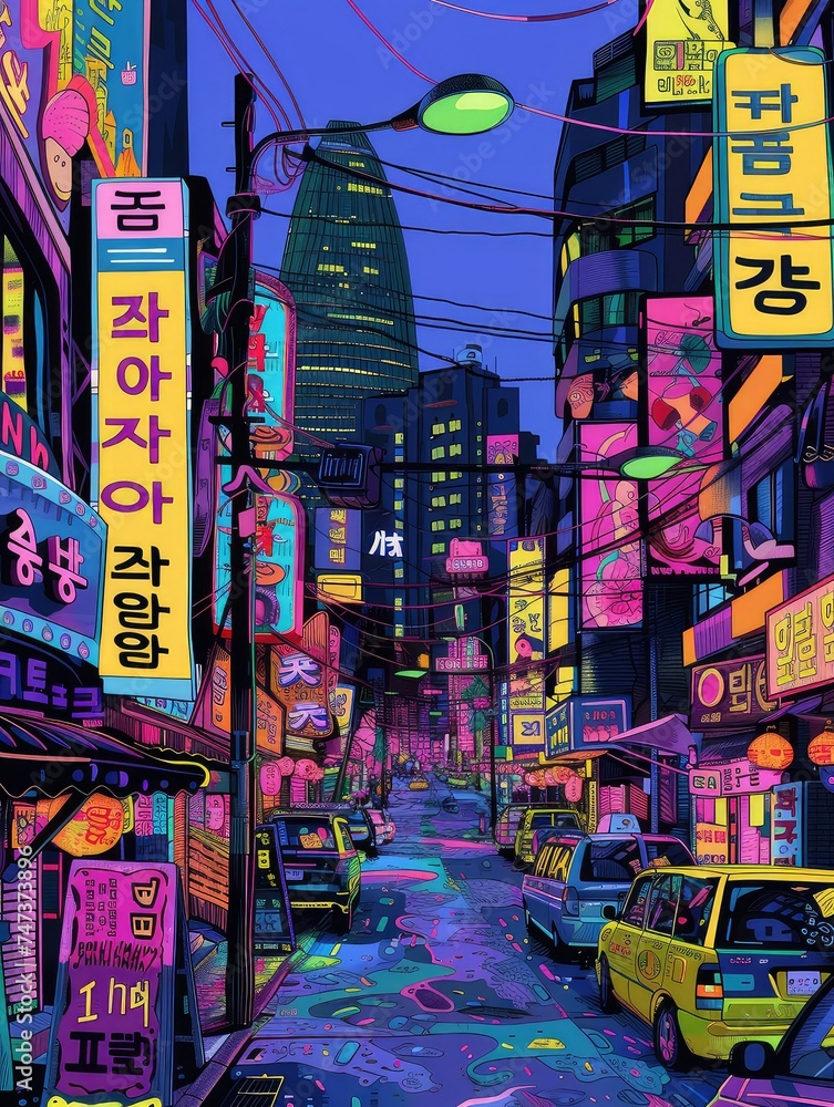 Tranh dán tường cảnh Hàn Quốc về đêm trang trí quán ăn, nhà hàng.
