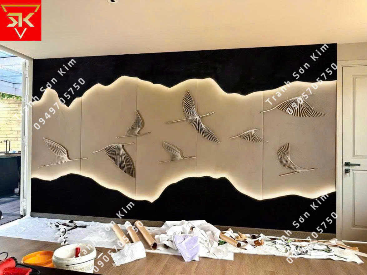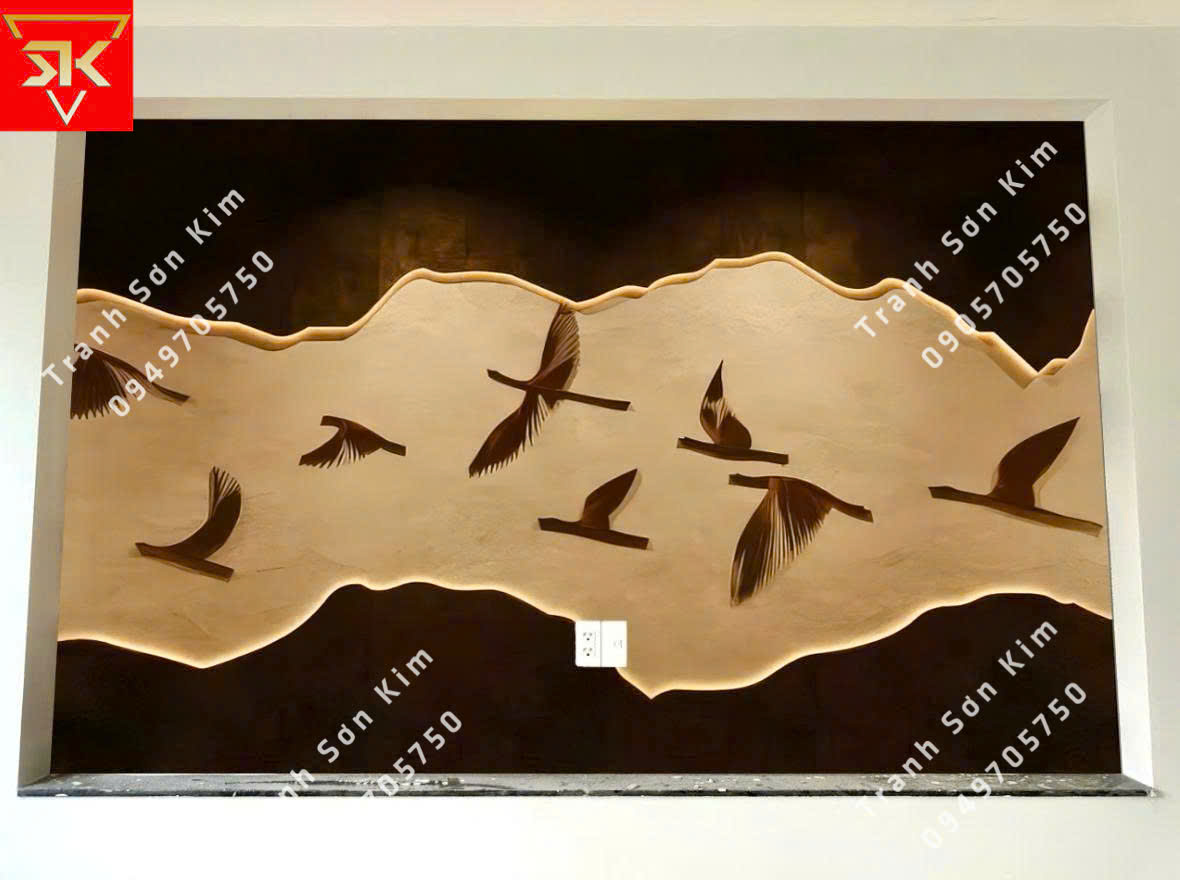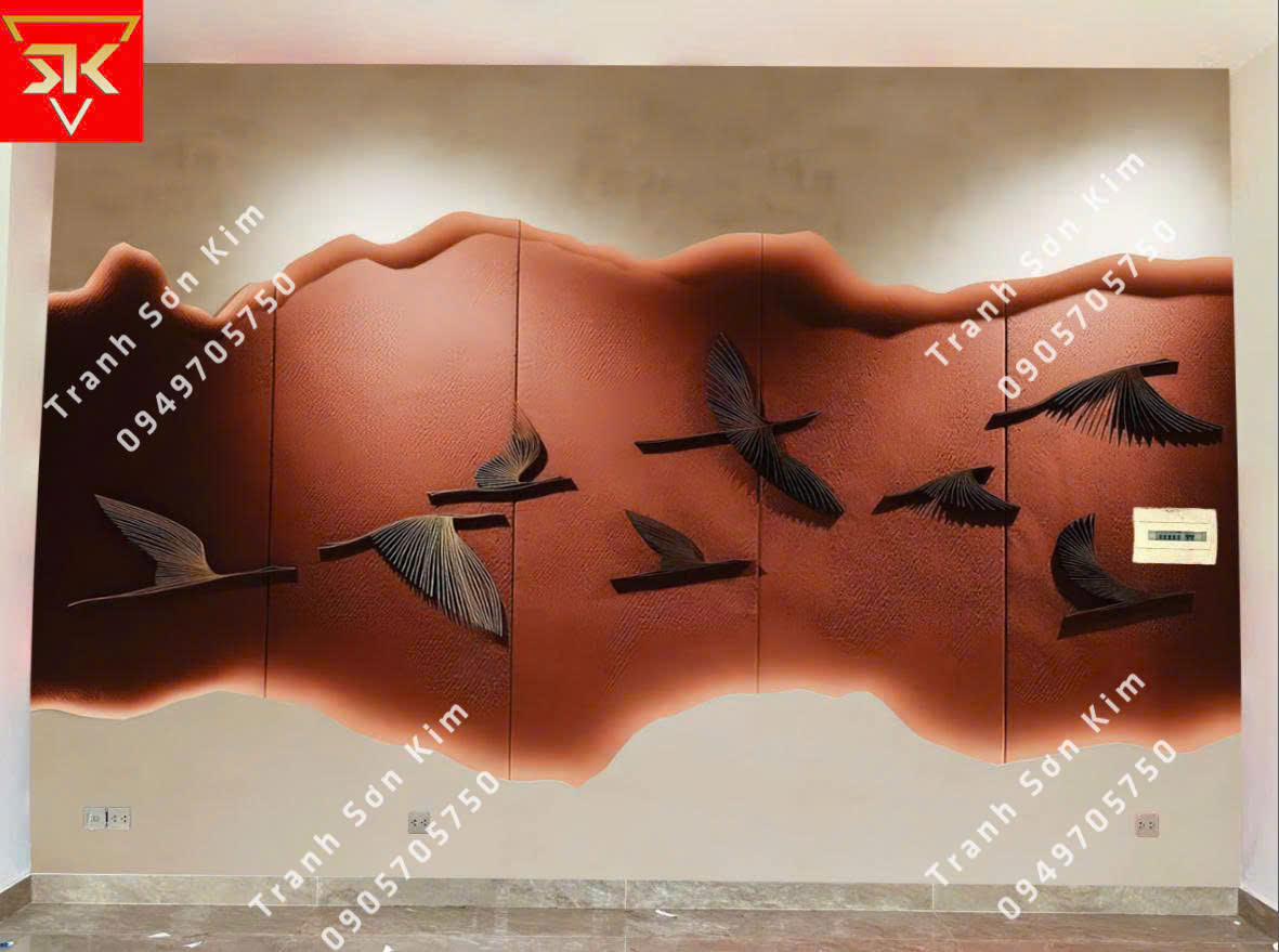 Chỉ với vài đường nét mềm mại, Sơn Kim đã đưa người xem đi qua nhiều cung bậc cảm xúc với mẫu tranh điêu khắc lam sóng hiện đại, tối giản mà vẫn đầy sức sống. Hình ảnh đàn chim tung cánh giữa không trung, biểu tượng cho tự do, khát vọng và bình an. Đặc biệt nổi bật dưới ánh đèn hắt nhẹ, giúp bức tranh trở nên có chiều sâu và sống động. Những đường uốn lượn mềm mại mô phỏng đường núi hay mây trời, mang lại cảm giác tự nhiên, thanh thoát và tinh tế.