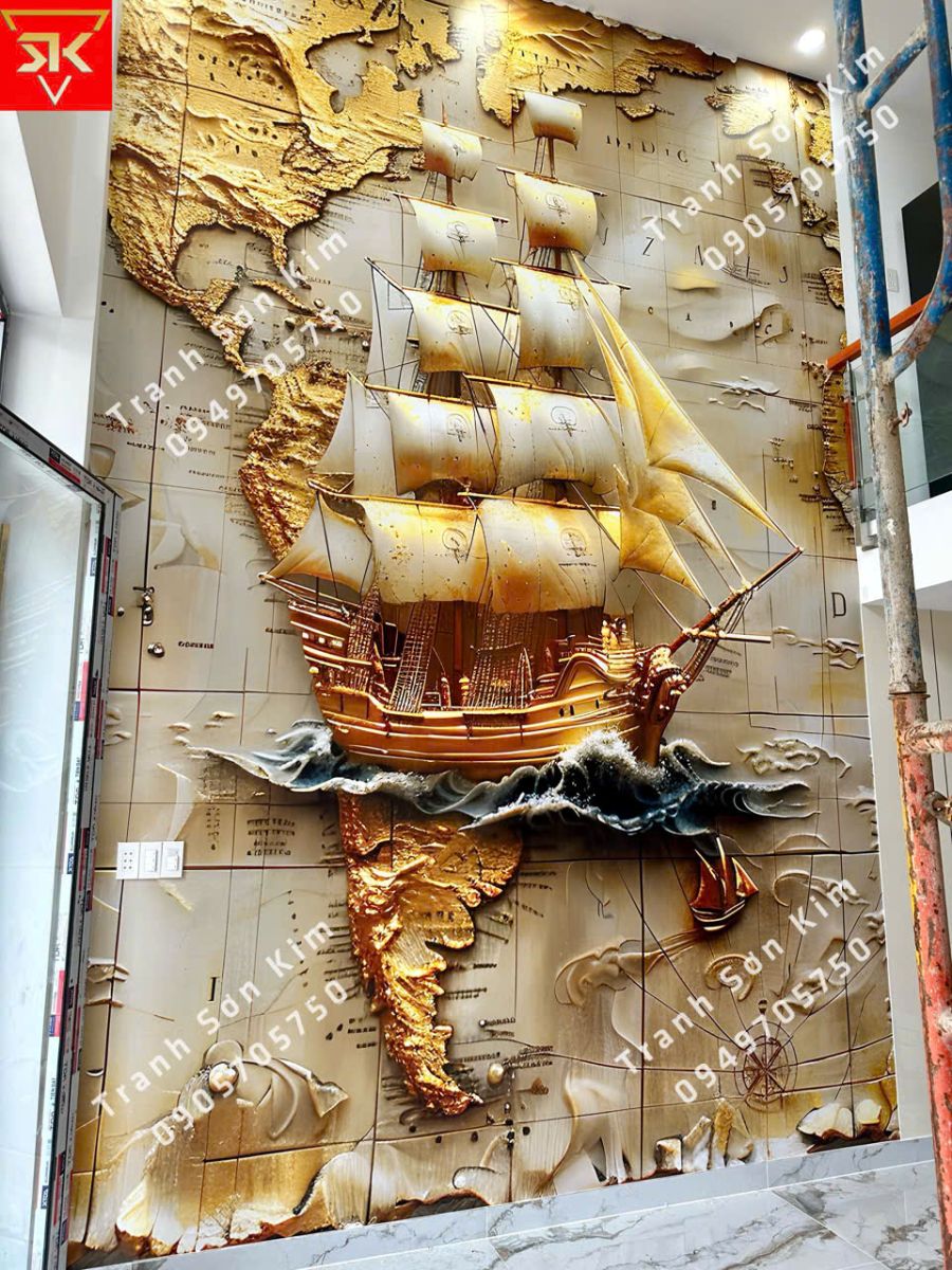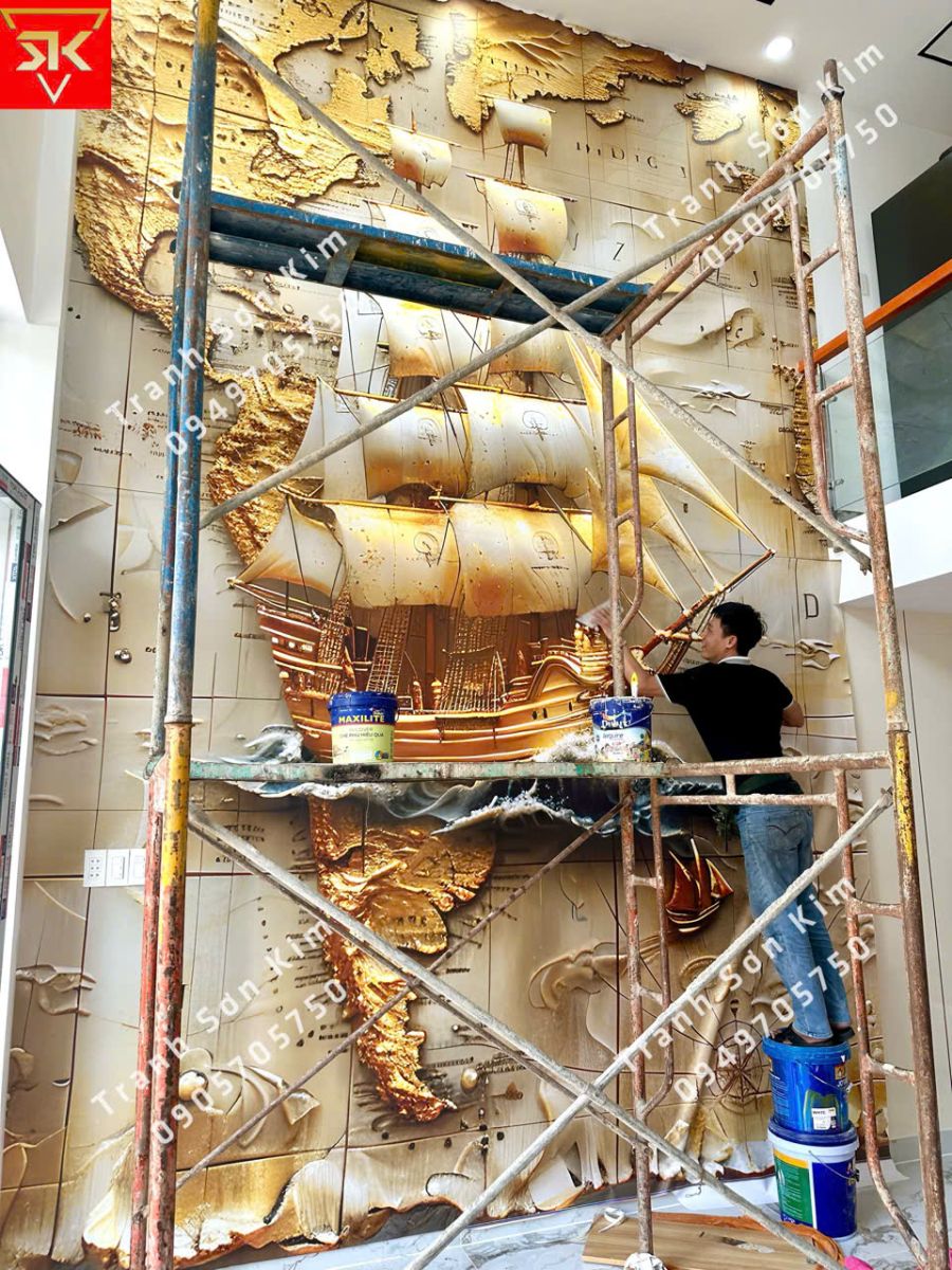 Thi công tranh 3d dát vàng thuyền buồm cho phòng khách