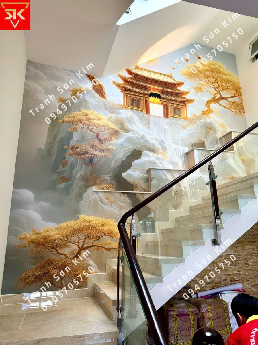 Tiếp nối không gian, vách cầu thang là bức tranh cung điện cổ uy nghi giữa núi đá trắng và thác nước mềm mại, tỏa sắc vàng sang trọng. Hình ảnh này gợi cảm giác quyền quý, bề thế, đồng thời thể hiện tầm nhìn xa và bản lĩnh của gia chủ – người trân trọng giá trị truyền thống nhưng vẫn biết cách đưa vào hơi thở hiện đại.