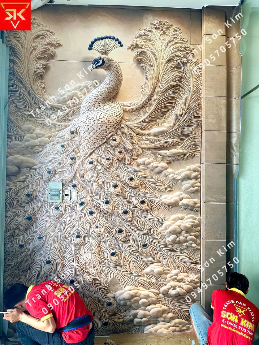 Thi công tranh dán tường điêu khắc chim công phòng khách