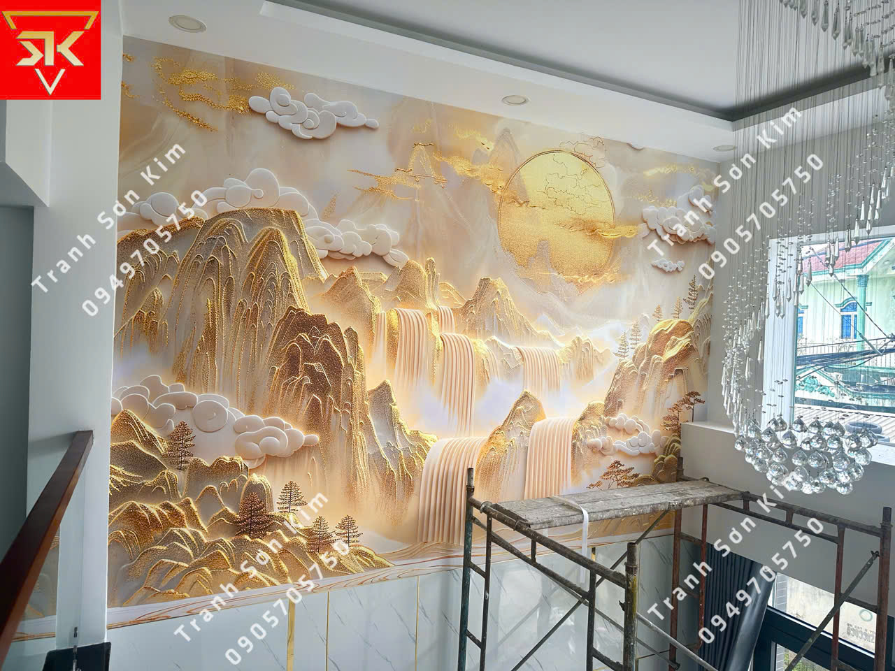 Thi công tranh dán tường điêu khắc nhủ vàng cho phòng khách
