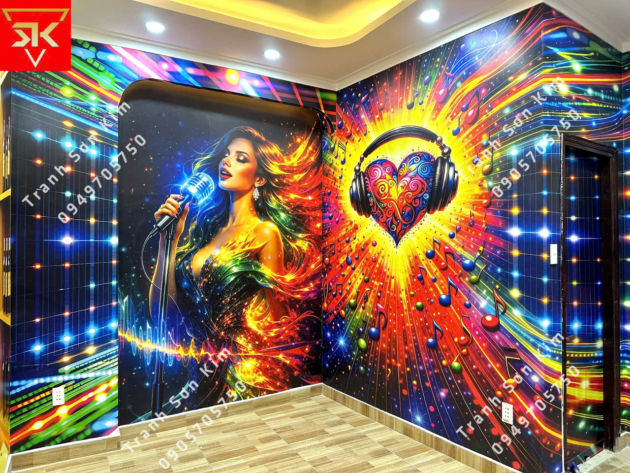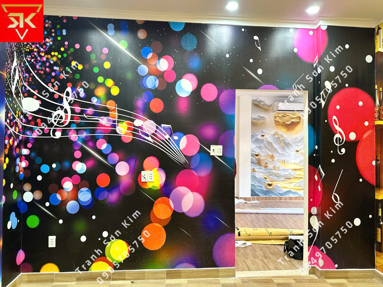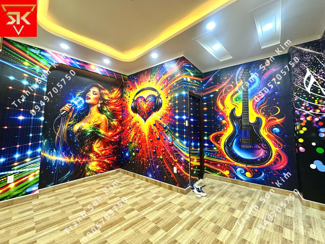 Tranh dán tường 3d Sơn Kim đa dạng với những mẫu mới mới hoàn toàn đáp ứng các yêu cầu về thiết kế phối cảnh của phòng hát karaoke. Với những màu sắc nổi bật sẽ khiến phòng Karaoke của bạn thêm lung linh dưới ánh đèn led.