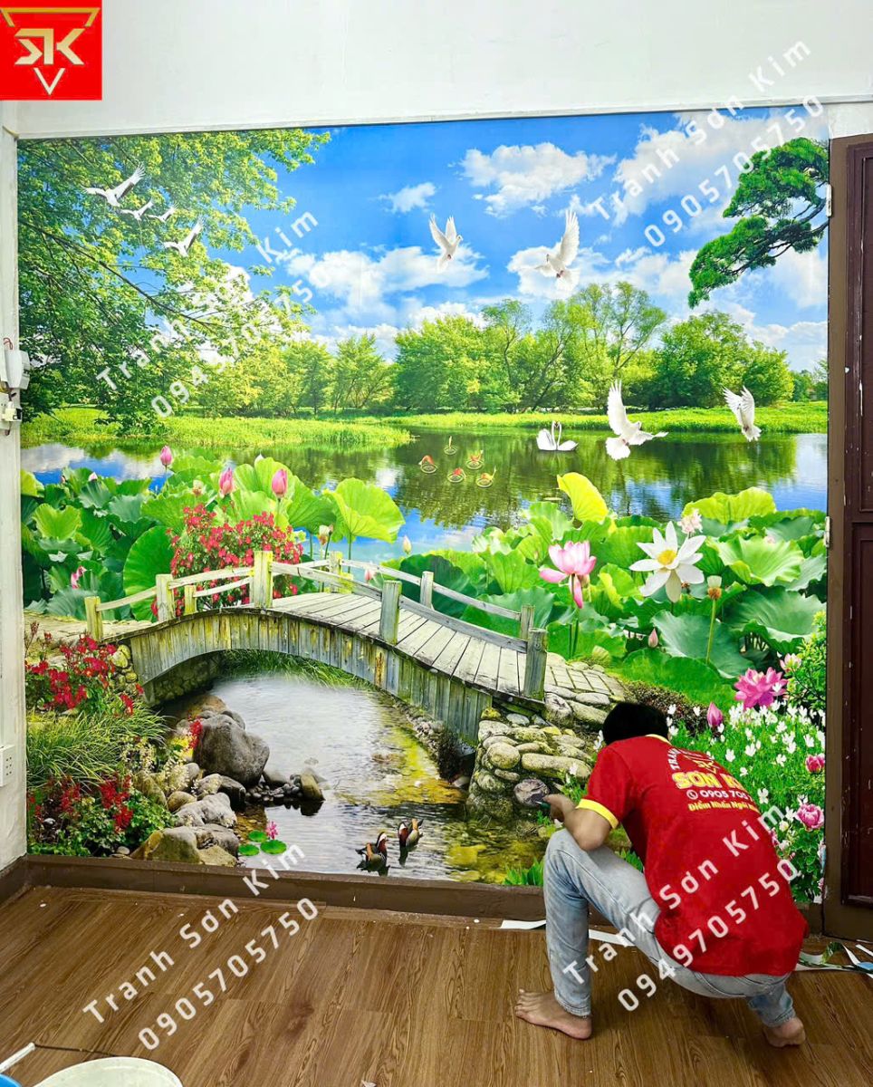 Tranh dán tường 3D phong cảnh thiên nhiên vườn hoa, sông nước, con đường, con vật..vv