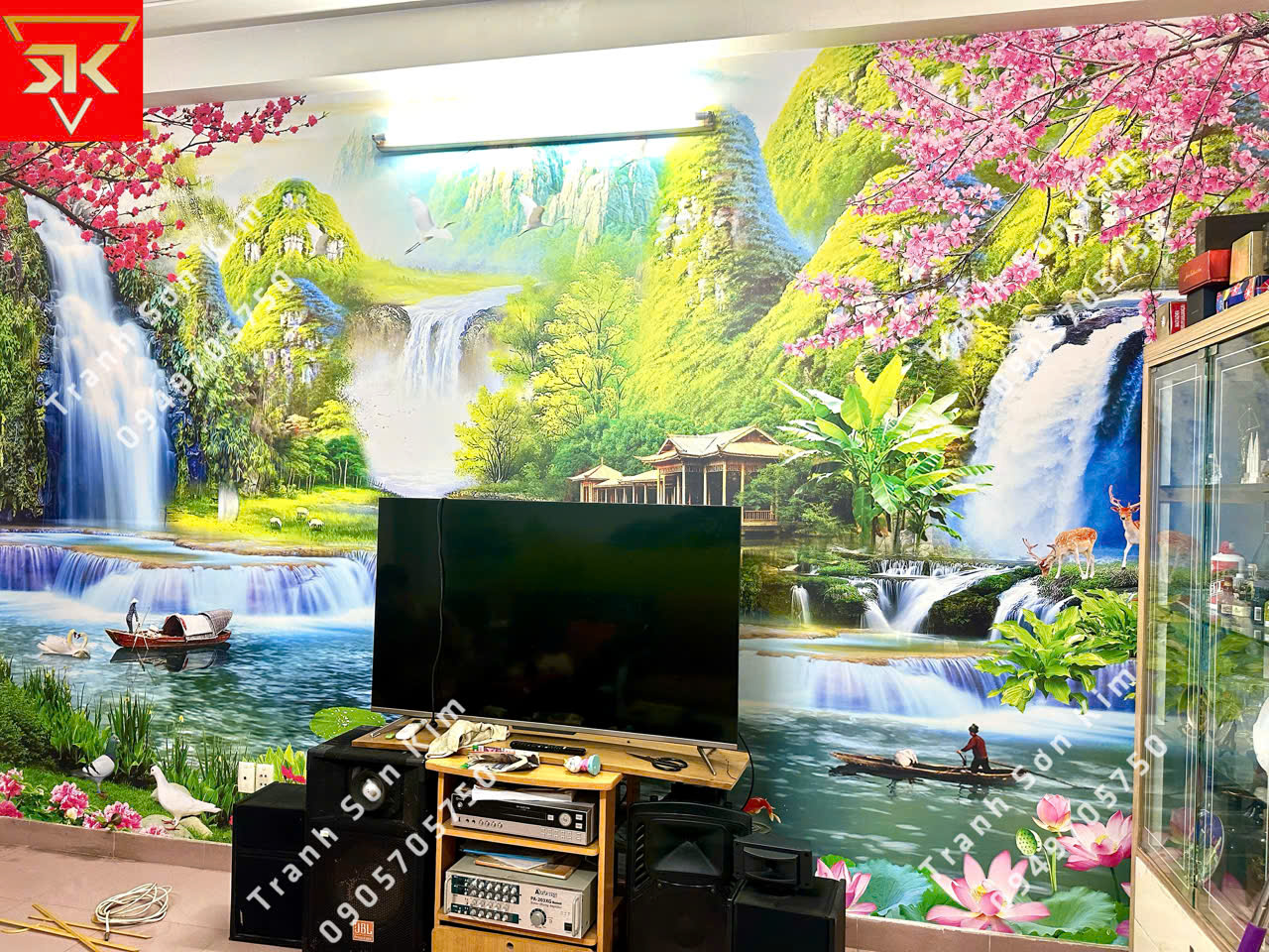 Thi công tranh dán tường cảnh thác nước điểm nhấn phòng khách
