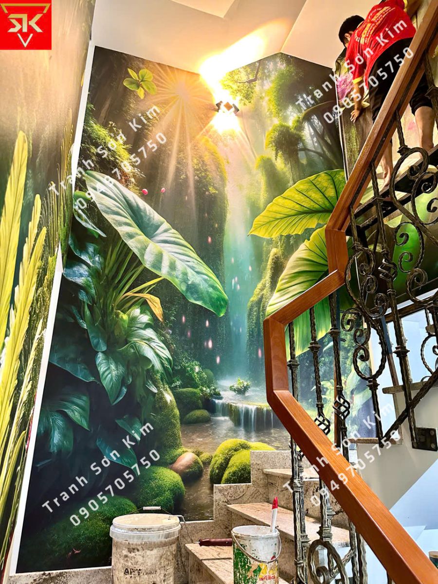 Thi công tranh dán tường phong cảnh rừng nhiệt đới cầu thang