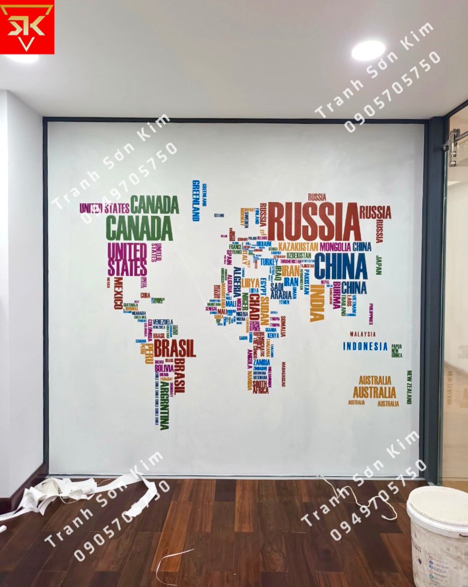 Thi công tranh dán tường bản đồ biểu tượng của các quốc gia cho phòng tiếp khách