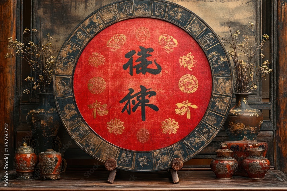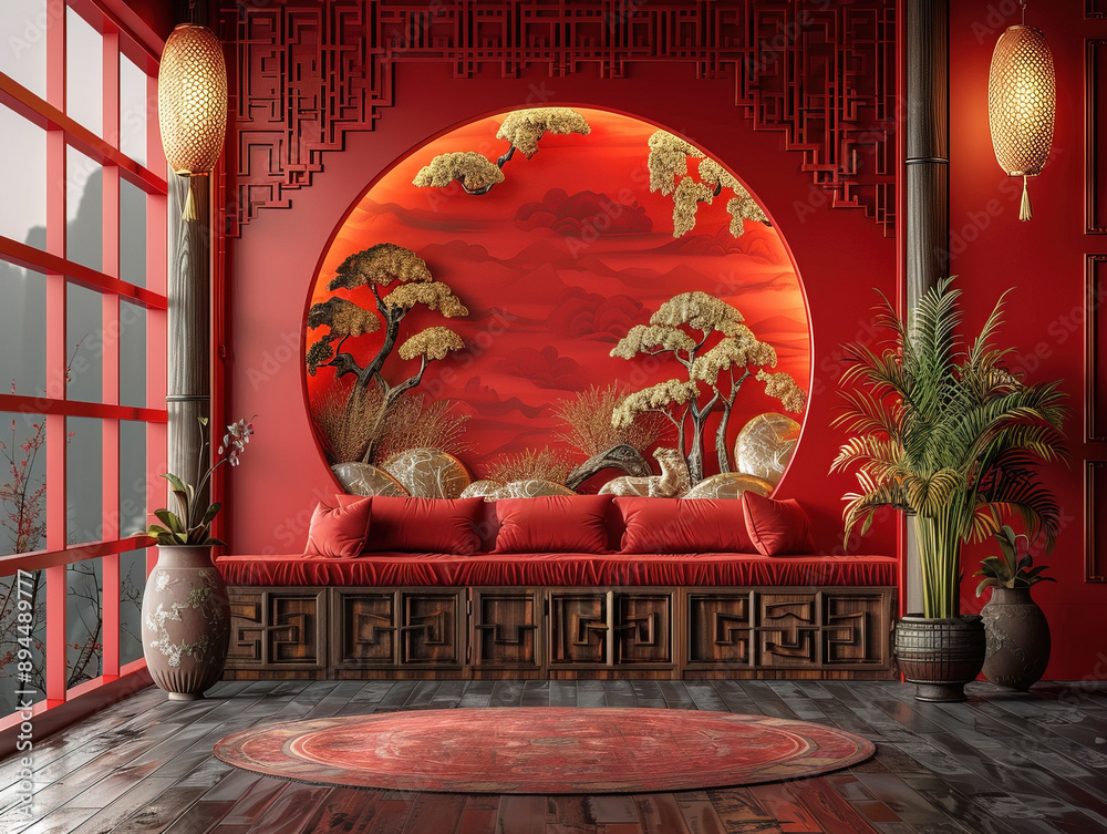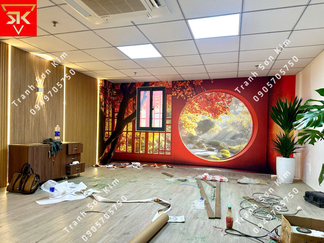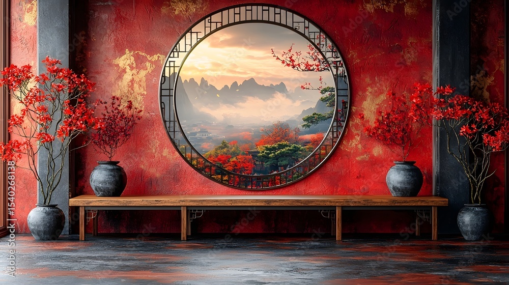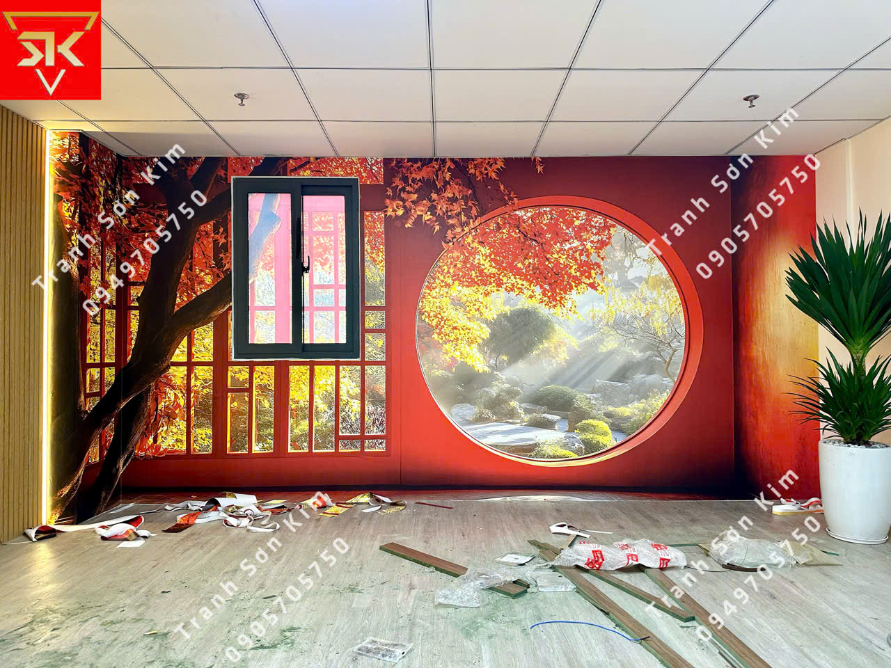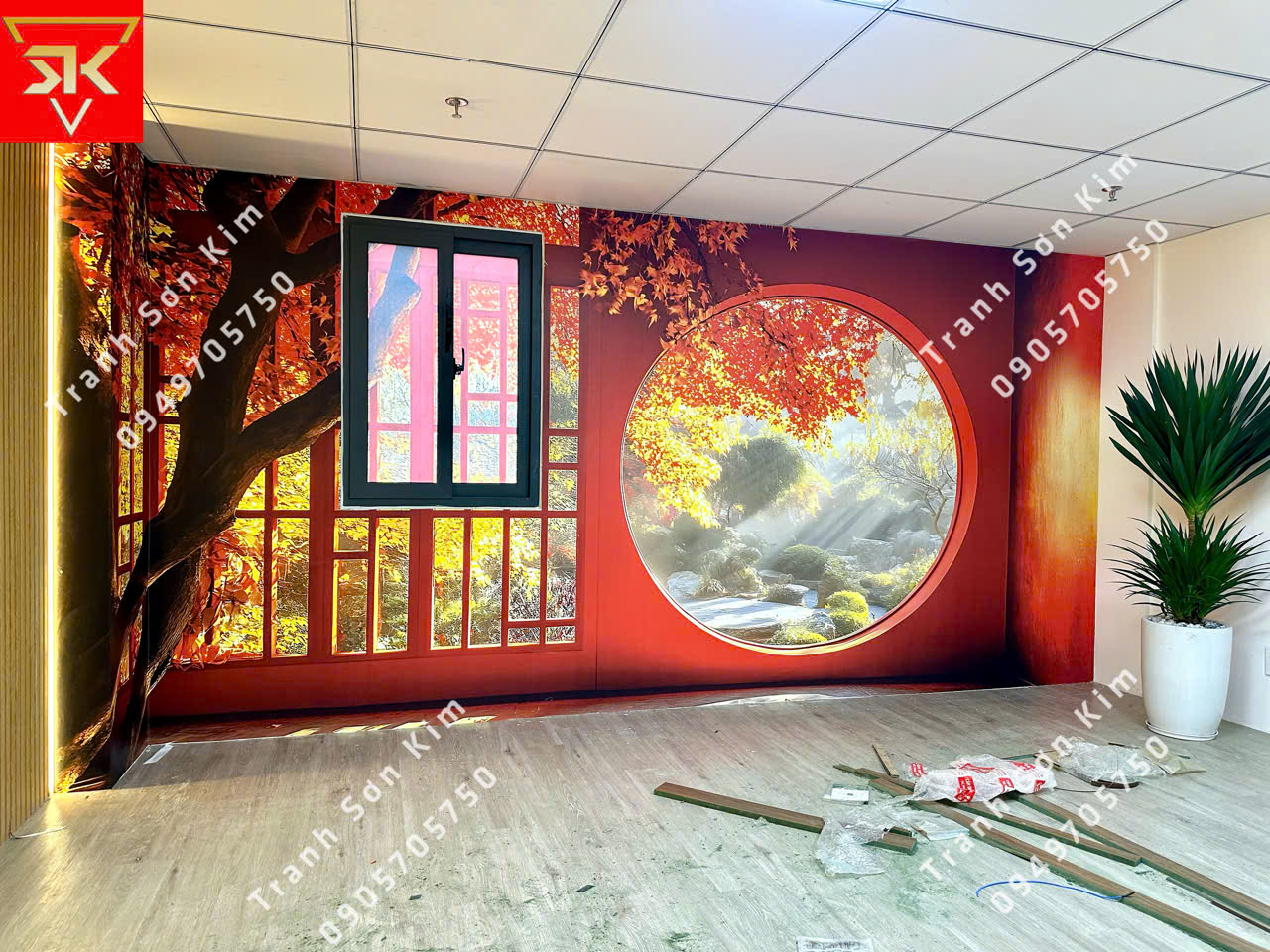 Bức tranh cửa sổ nền đỏ phong cảnh Nhật Bản thiền tịnh, trang trí văn phòng công ty bất động sản, vừa tạo cảm giác ấm cúng, thu hút năng lượng tích cực, vừa mang lại vượng khí cho gia chủ mệnh Hỏa.
