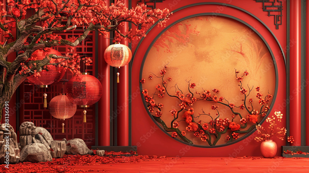 Mẫu Tranh Dán Tường Hoa Ngọc Lan Đỏ Thắm Trong Nắng Mai, Thiết Kế Trong Ô Cửa Vòm Tròn Phong Cách Trung Hoa Tuyệt Đẹp.