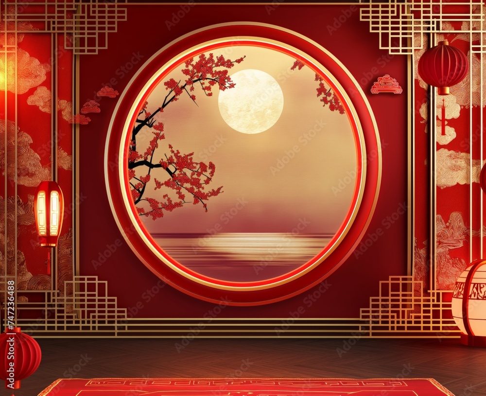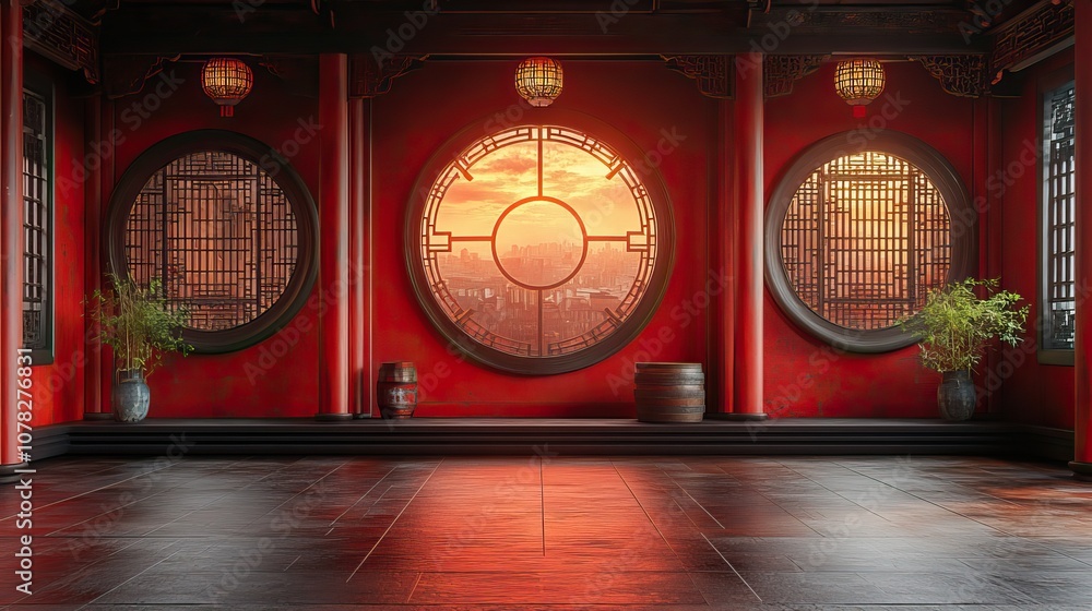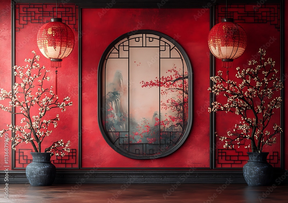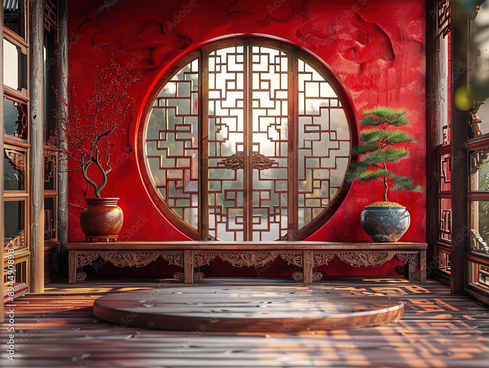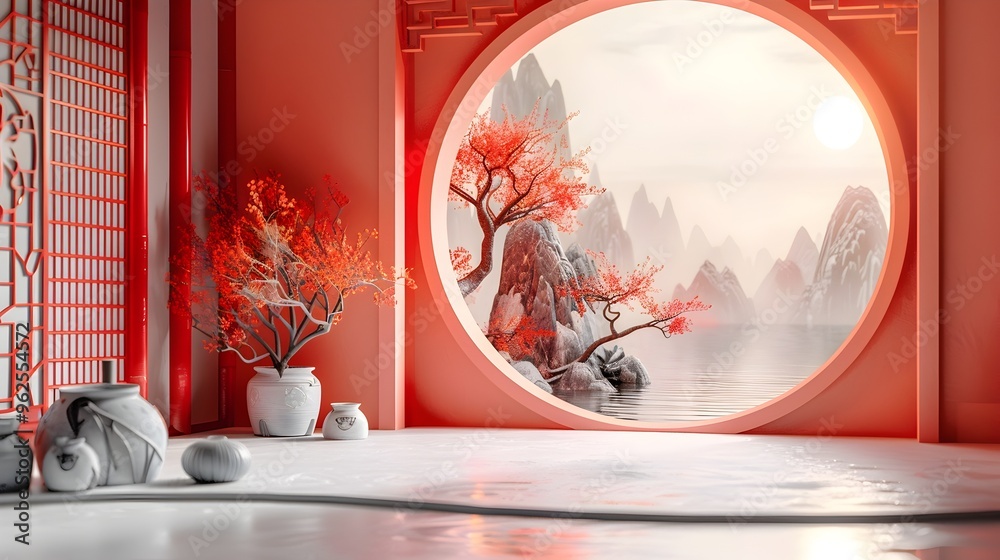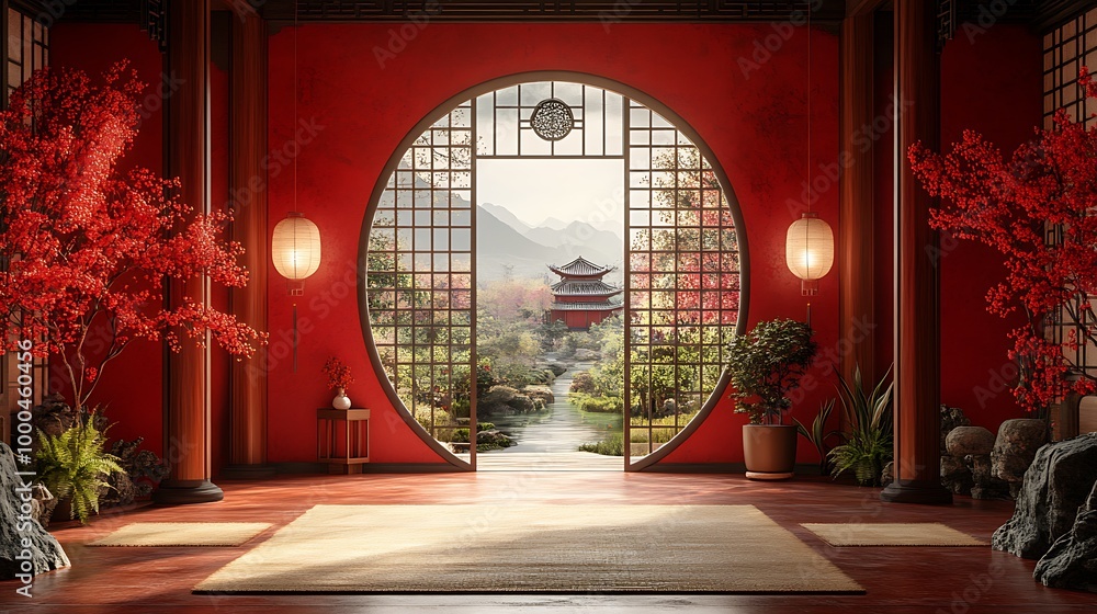 Tranh Dán Tường 3D Cửa Sổ Vòm Tròn Phong Cách Trung Hoa