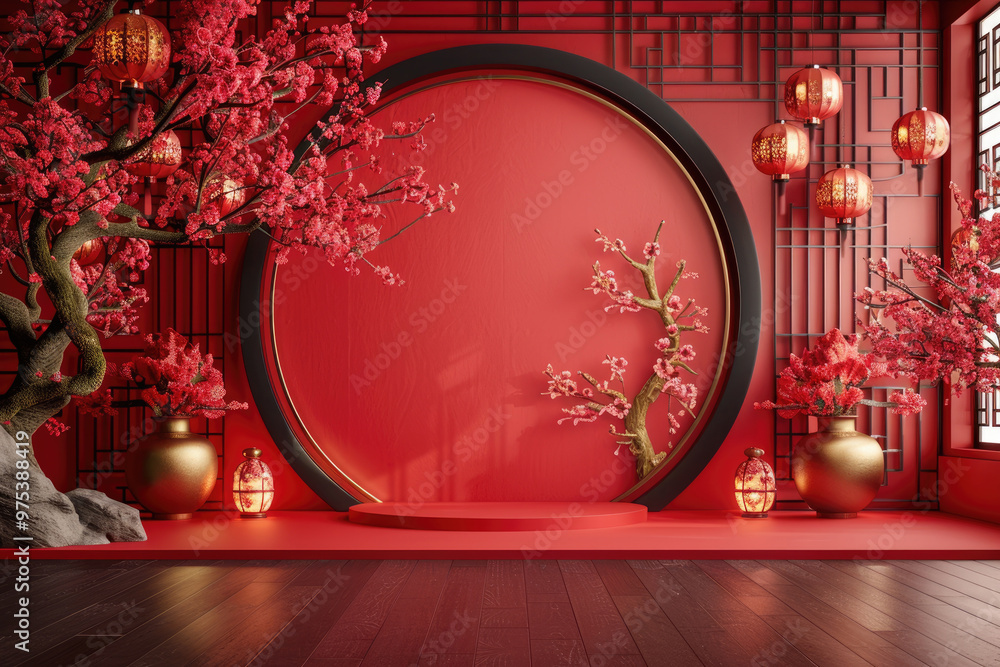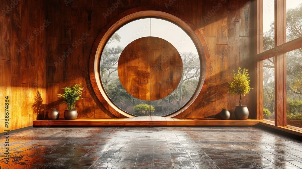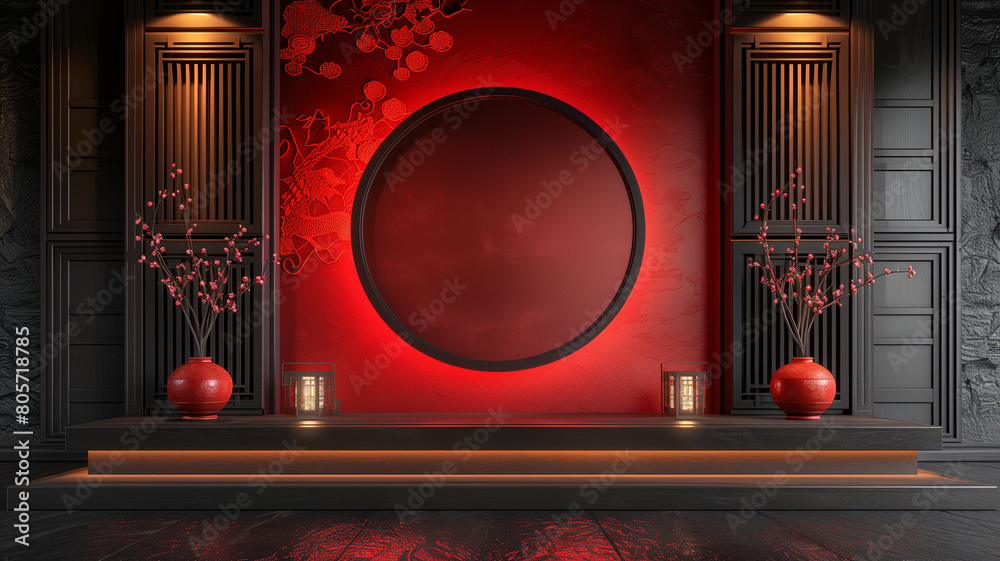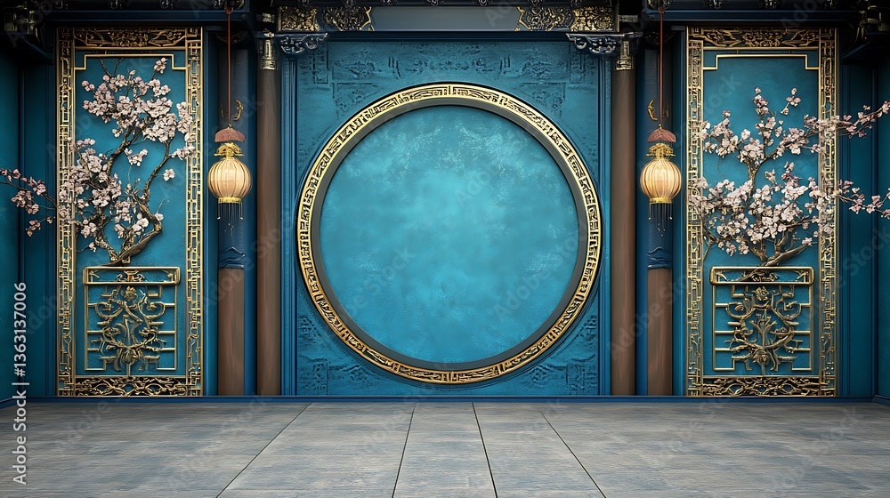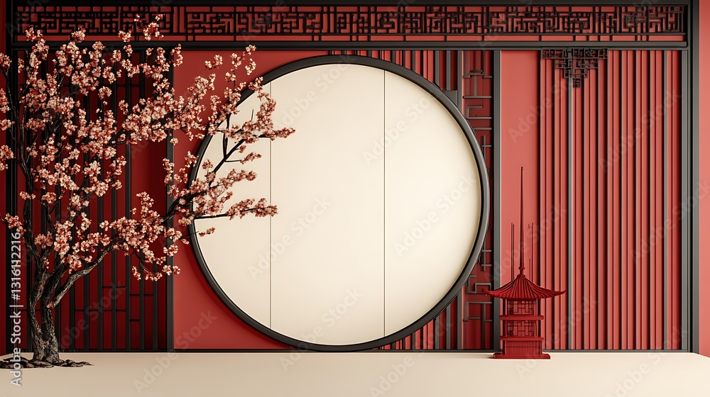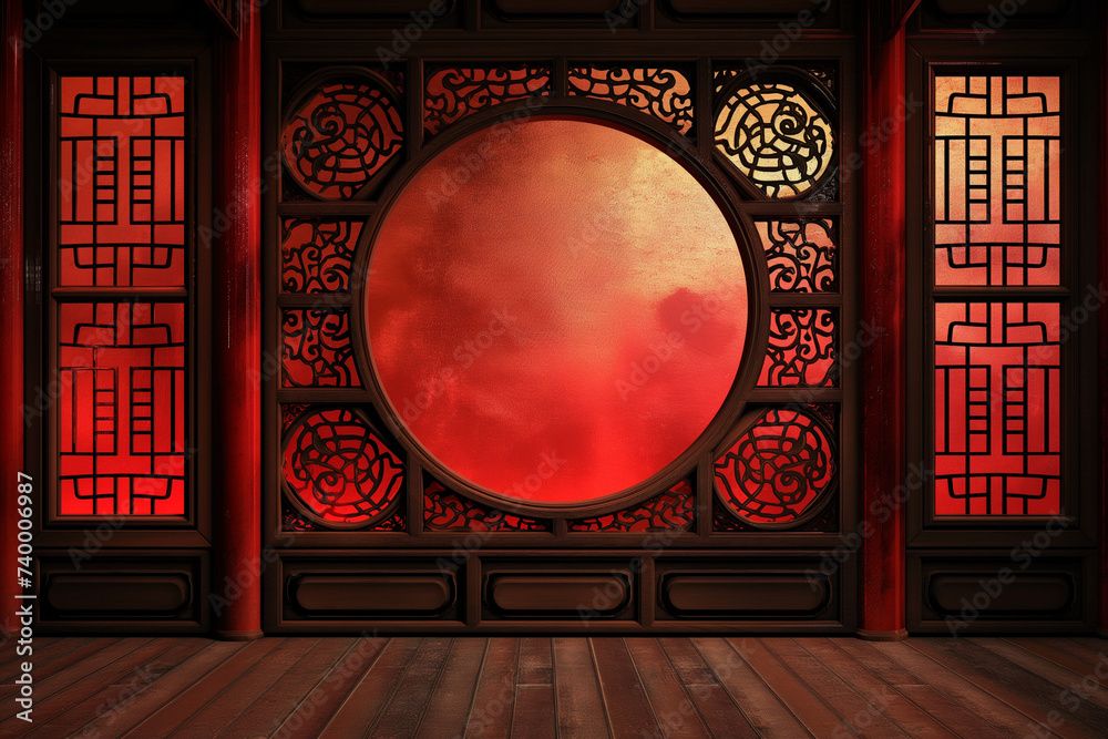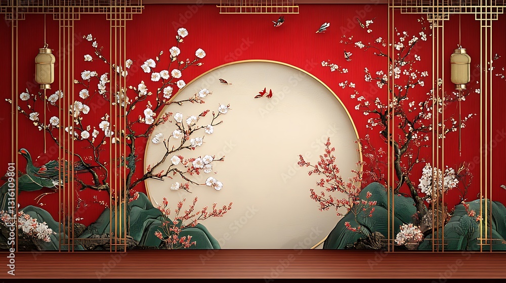 Tranh Dán Tường 3D Cửa Sổ Vòm Tròn Phong Cách Trung Hoa