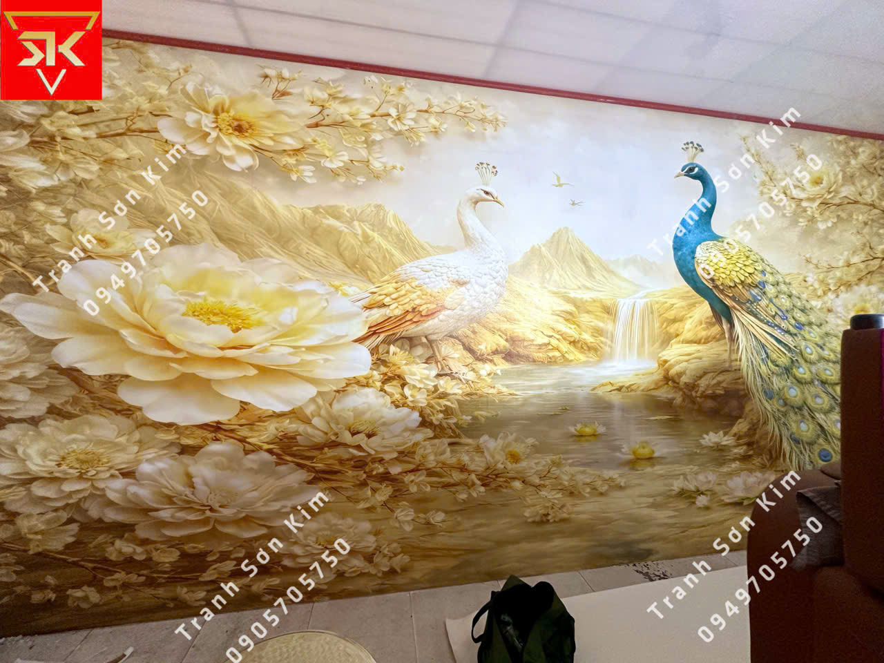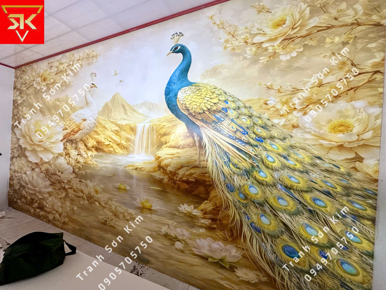 Thi công tranh dán tường 3D chim công núi vàng cho spa