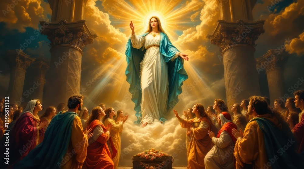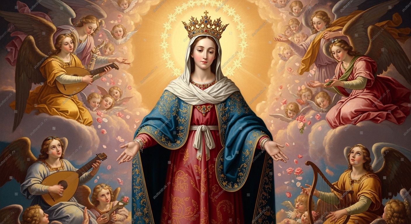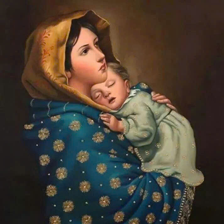 Thi công tranh dán tường Chúa, Đức Mẹ Và Các Thiên Thần cho phòng khách