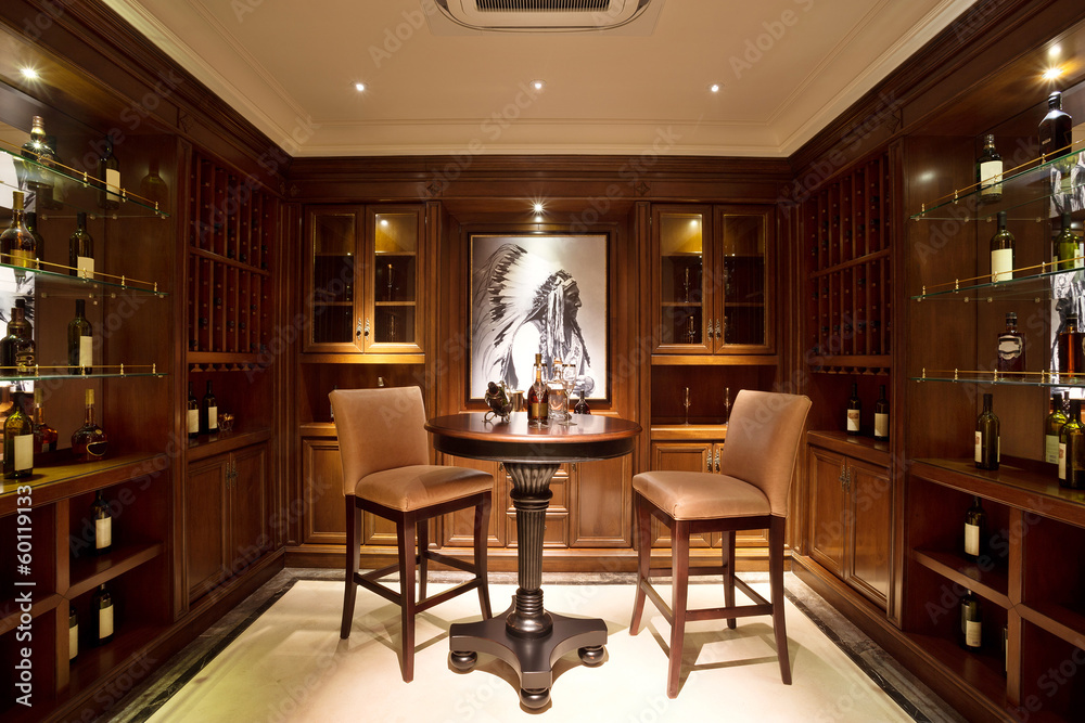 Thi công tranh dán tường kệ tủ trưng bày rượu cho phòng vip nhà hàng sang trọng