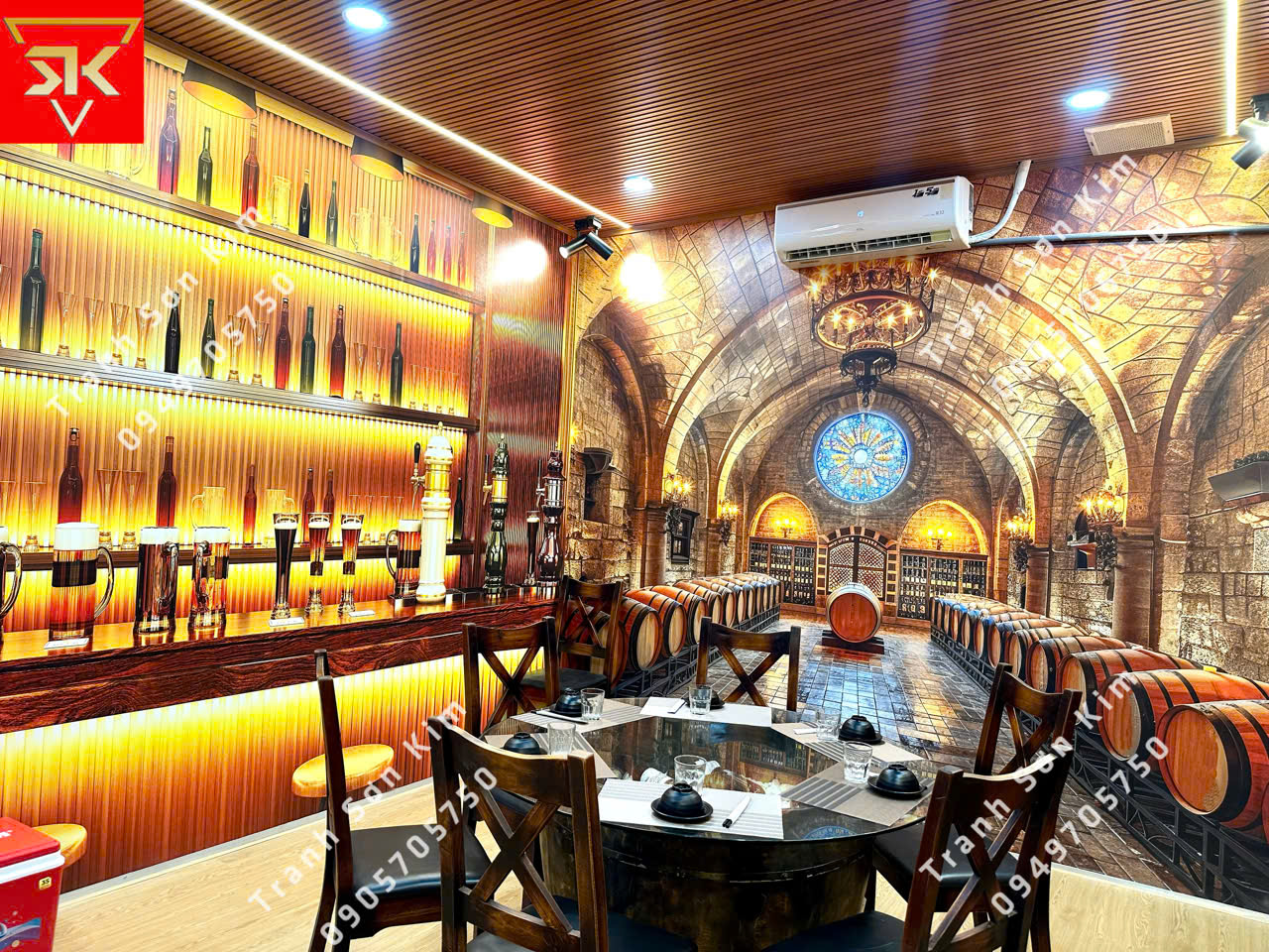 Thi công tranh dán tường hầm rượu vách background sân khấu nhà hàng