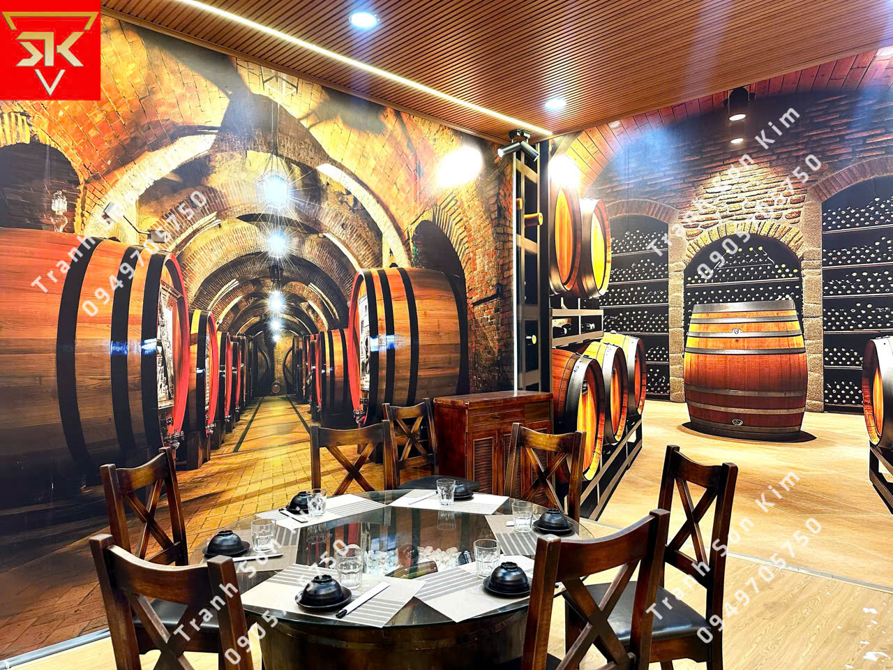 Thi công tranh dán tường hầm rượu cho phòng vip nhà hàng sang trọng