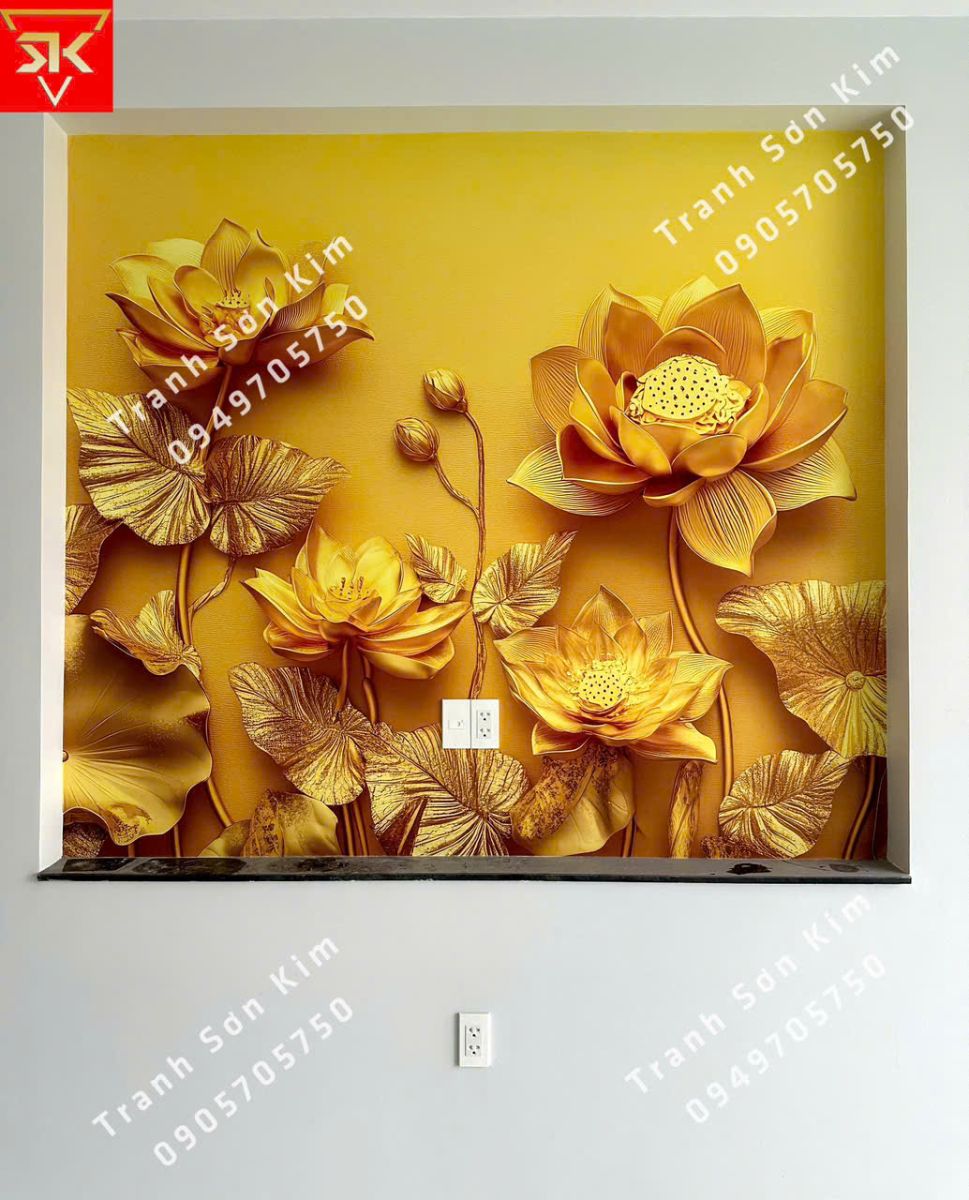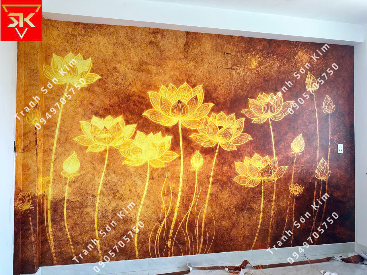 Thi công tranh dán tường hoa sen vàng ánh kim cho phòng khách