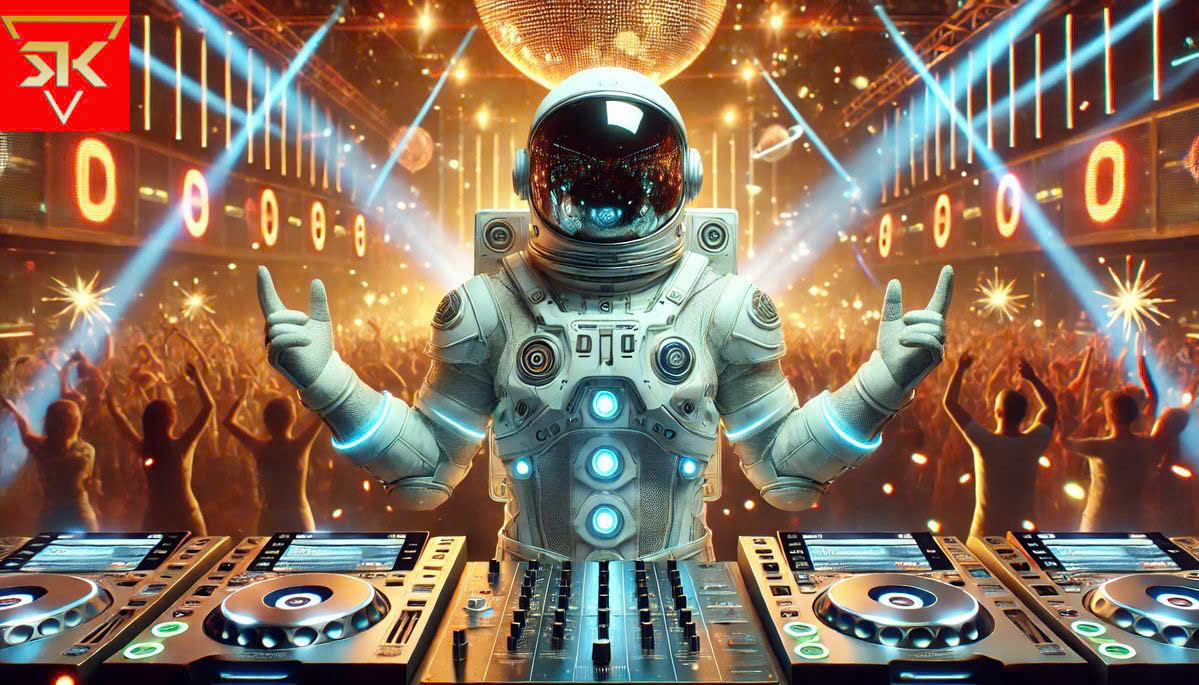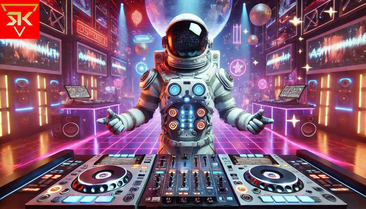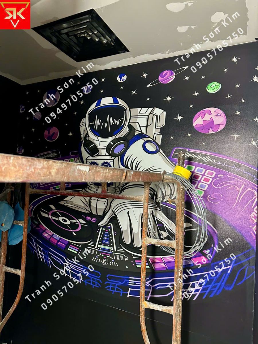 Thi công tranh dán tường phi hành gia chơi DJ cho phòng music box