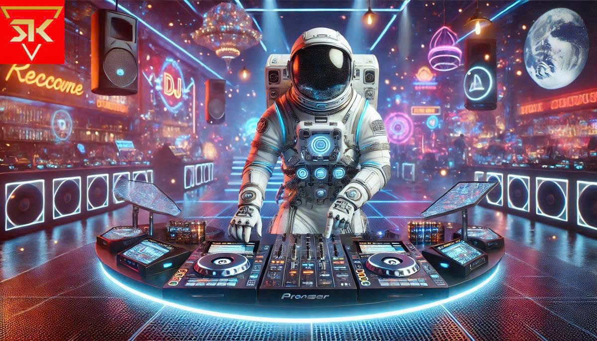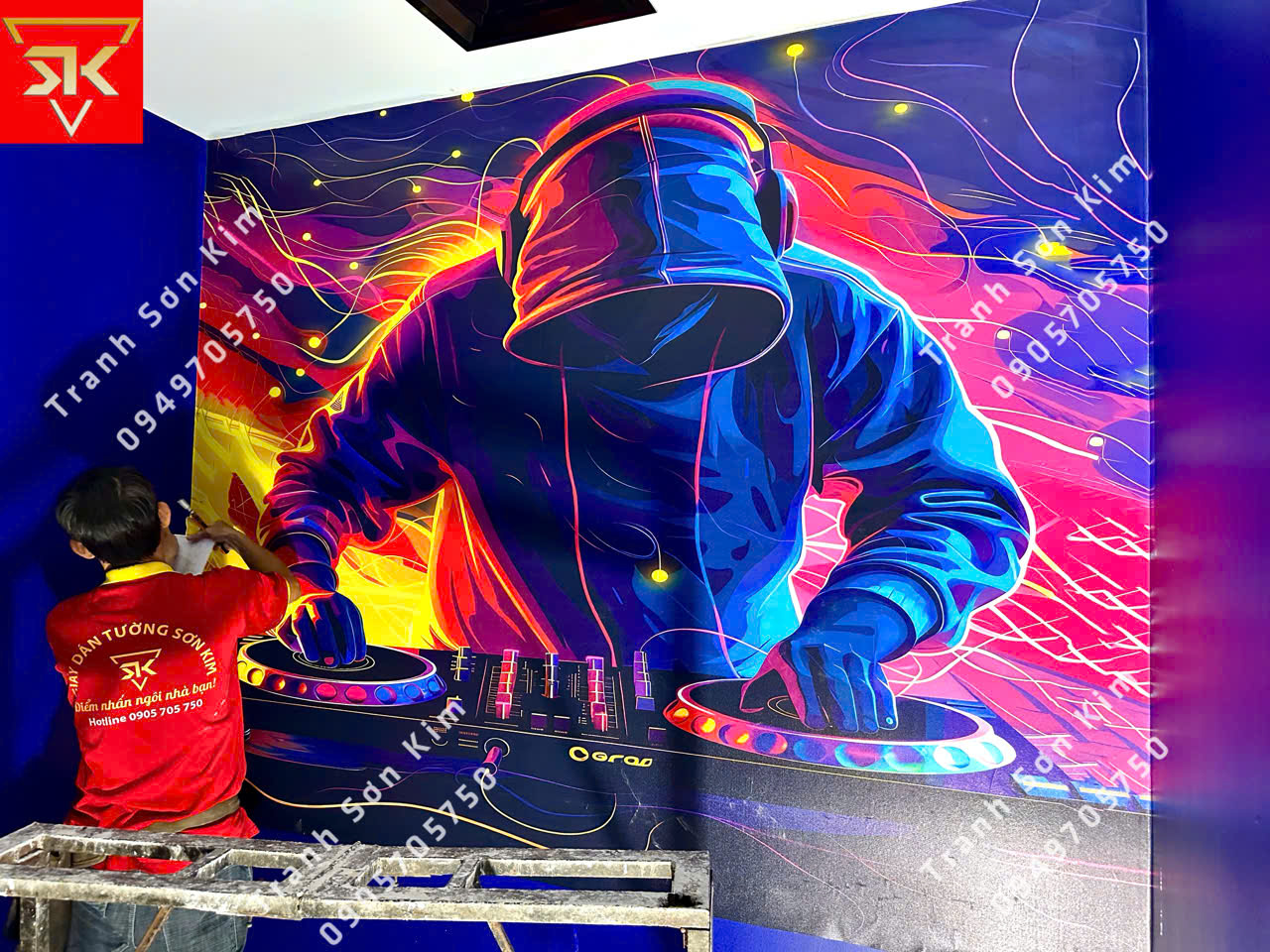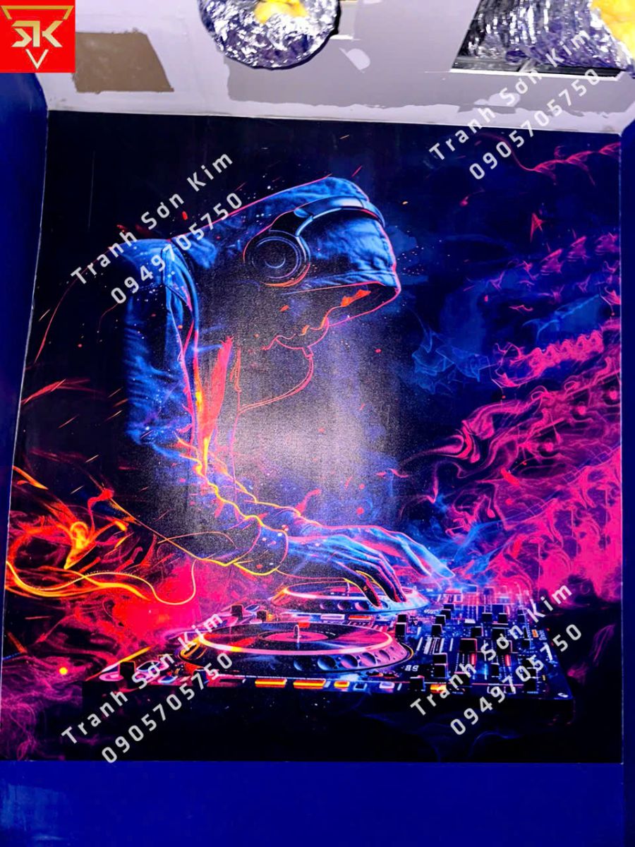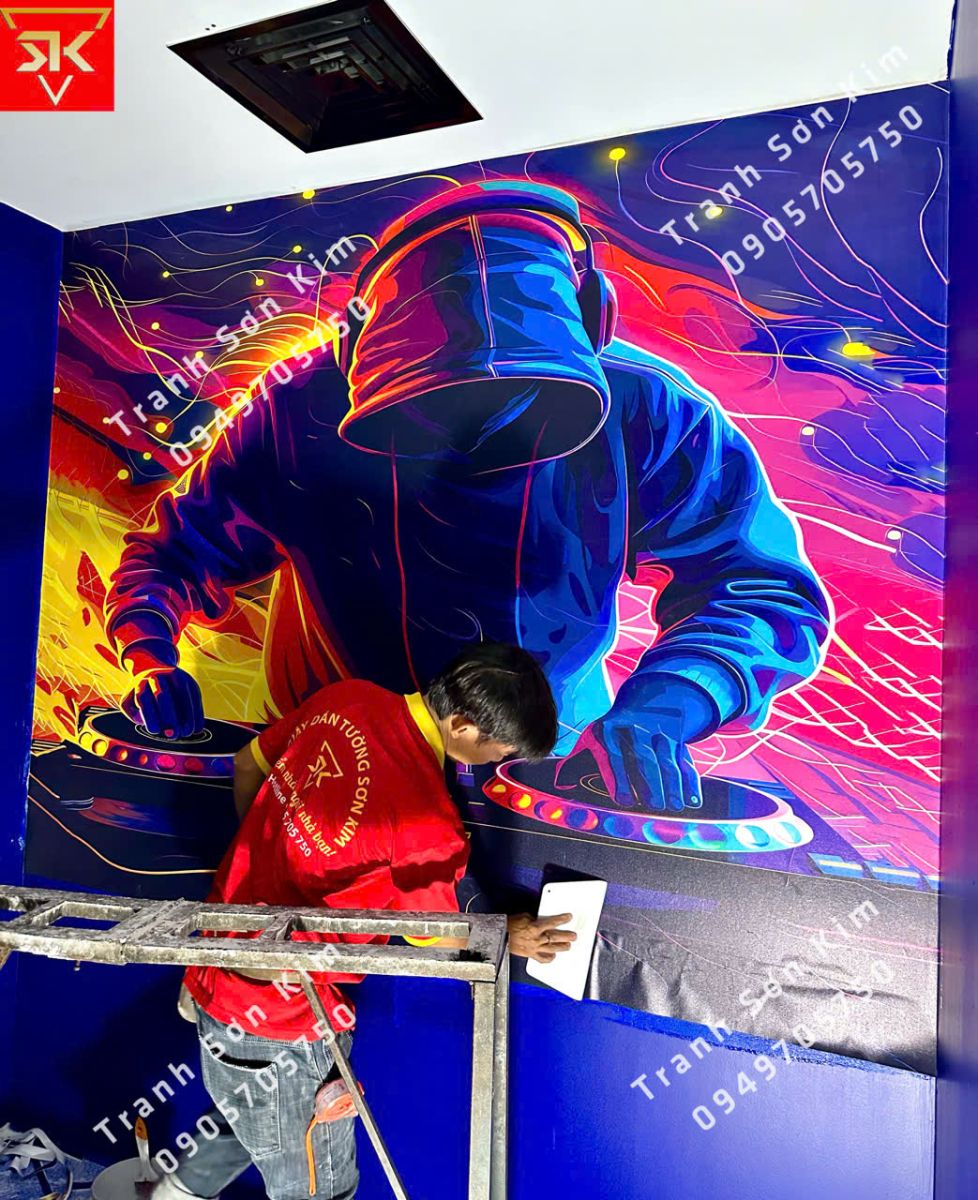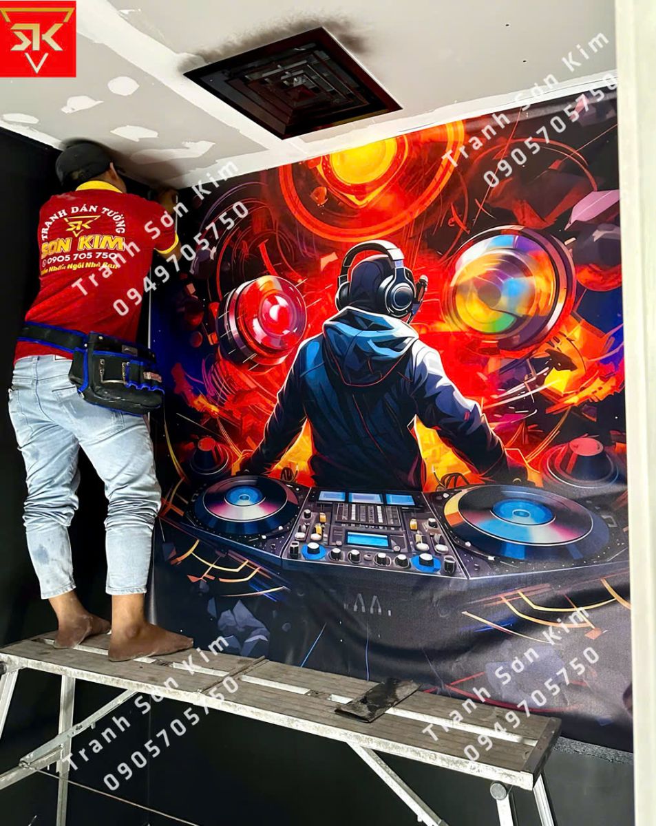 Tranh dán tường chủ đề DJ: Tinh tế với hình ảnh DJ trên bàn chơi nhạc, tạo không khí sôi động và hiện đại.