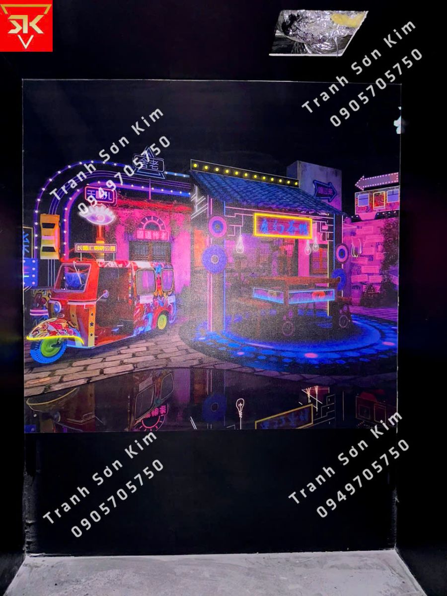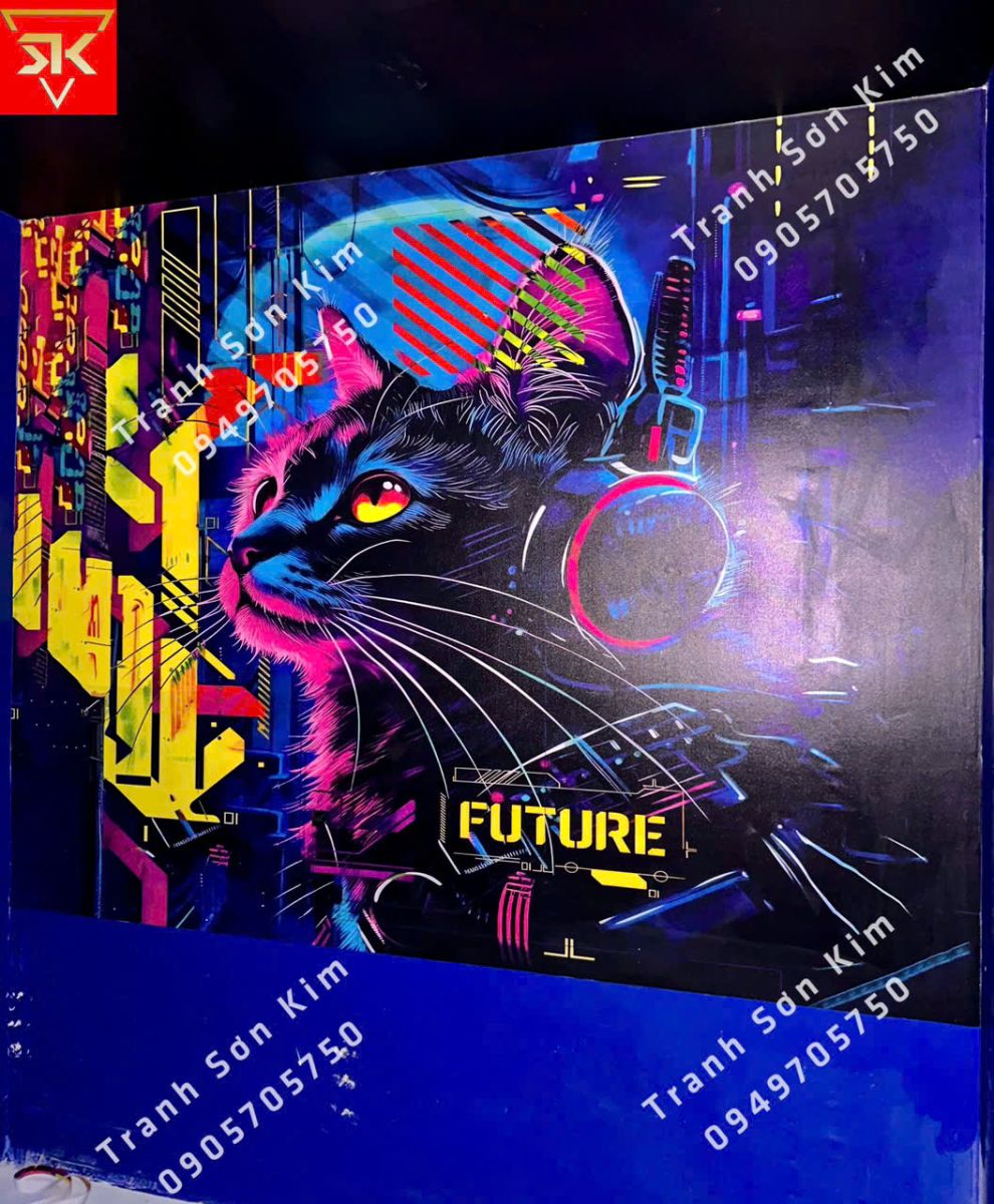 Một điểm nhấn nổi bật tại music box chính là bức tranh cô gái hiện đại với phong cách trừu tượng, được thể hiện bằng gam màu neon rực rỡ và ánh sáng sắc cạnh. Cô gái với mái tóc buộc cao, đeo tai nghe và kính mát phong cách cyberpunk, mang đến cảm giác của một thế giới tương lai đầy năng lượng. Những đường viền phát sáng trên trang phục tạo chiều sâu thị giác mạnh mẽ, khiến không gian quán trở nên sống động, cá tính và cực kỳ ấn tượng. Đây không chỉ là một bức tranh, mà còn là tuyên ngôn nghệ thuật cho phong cách trẻ trung, sáng tạo và khác biệt.