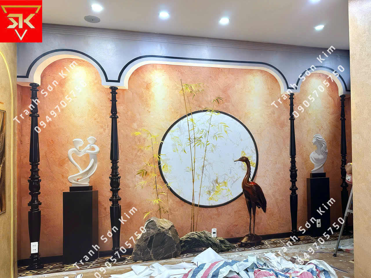 Thi công tranh dán tường phong cách indochine cho phòng khách