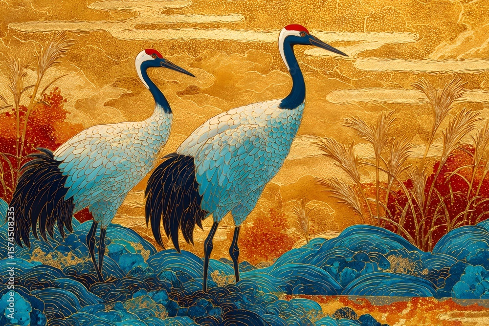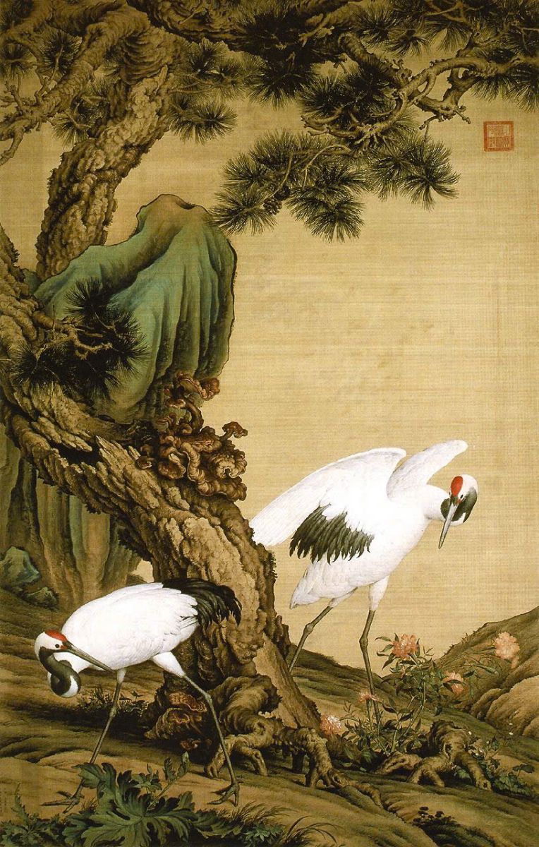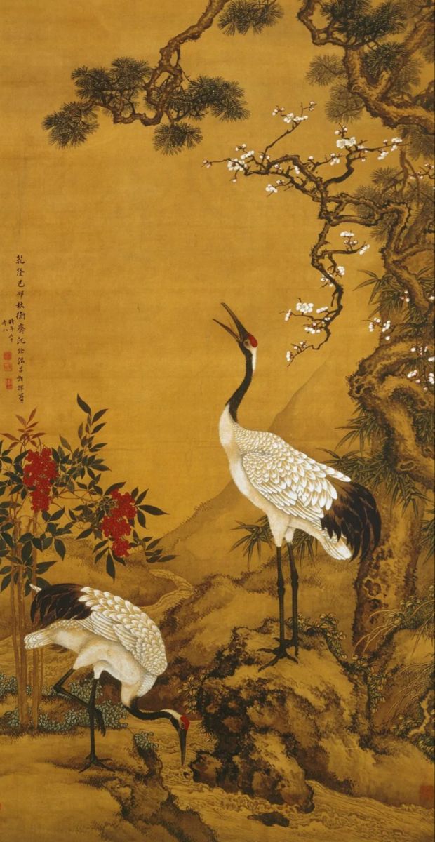 Màu sắc chủ đạo của tranh là màu vàng cam kết hợp với màu xanh của chim công, tạo nên sự hài hòa giữa vẻ đẹp thiên nhiên và kiến trúc hoài cổ. Hình ảnh chim công biểu tượng cho sự phú quý, quyền lực và vẻ đẹp kiêu sa, trong khi nhành hoa nhiệt đới tượng trưng cho sức sống và sự gắn kết với tự nhiên.