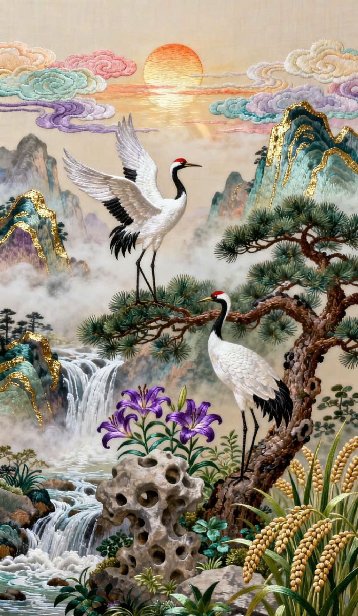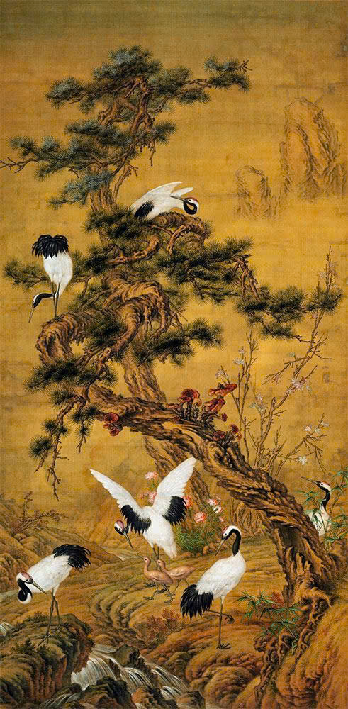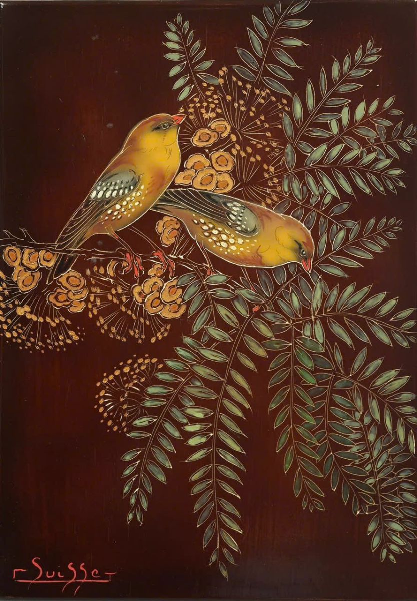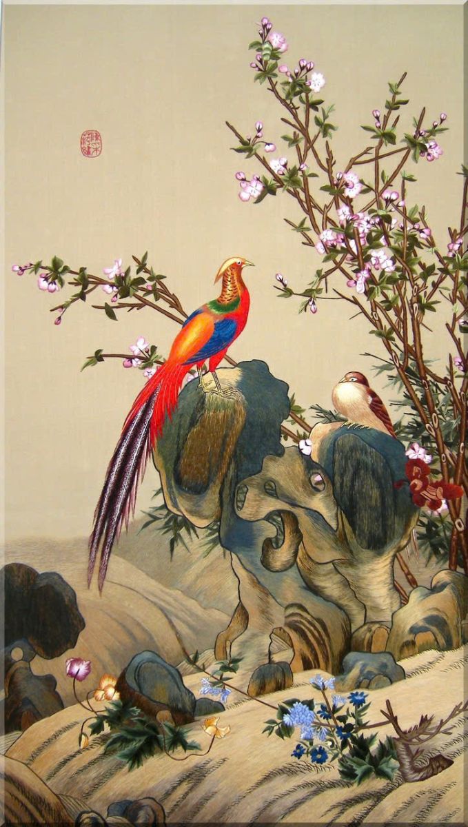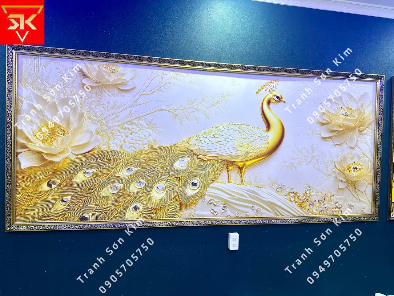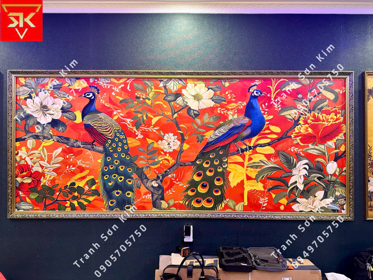Các họa tiết nổi bật trong tranh bao gồm các loài chim công sặc sỡ với bộ lông tuyệt đẹp, tạo nên không gian ấn tượng. Những chi tiết cổ điển được trang trí tỉ mỉ, mang đậm phong cách kiến trúc Đông Dương.
