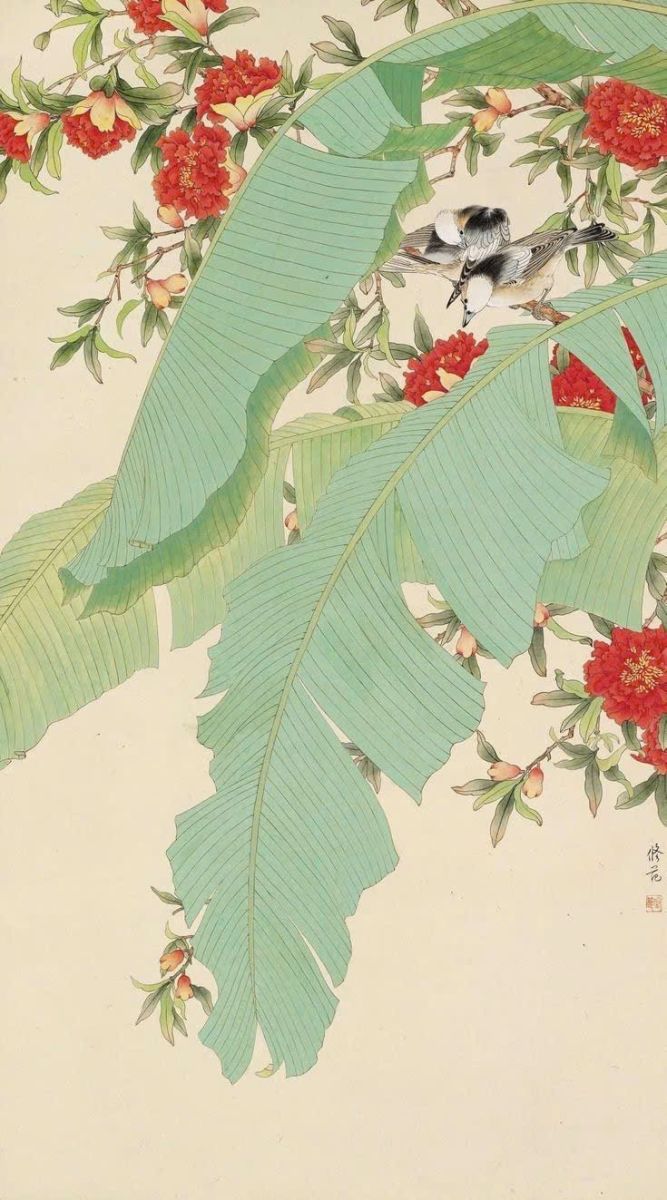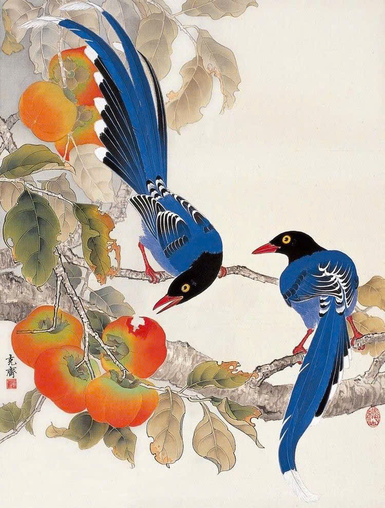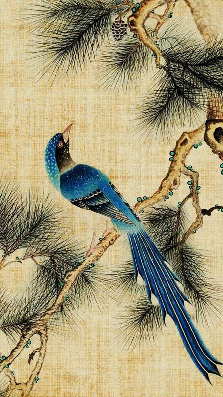 Tranh dán tường indochine đôi chim đậu trên nhành đào với tone màu xanh ngọc