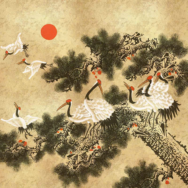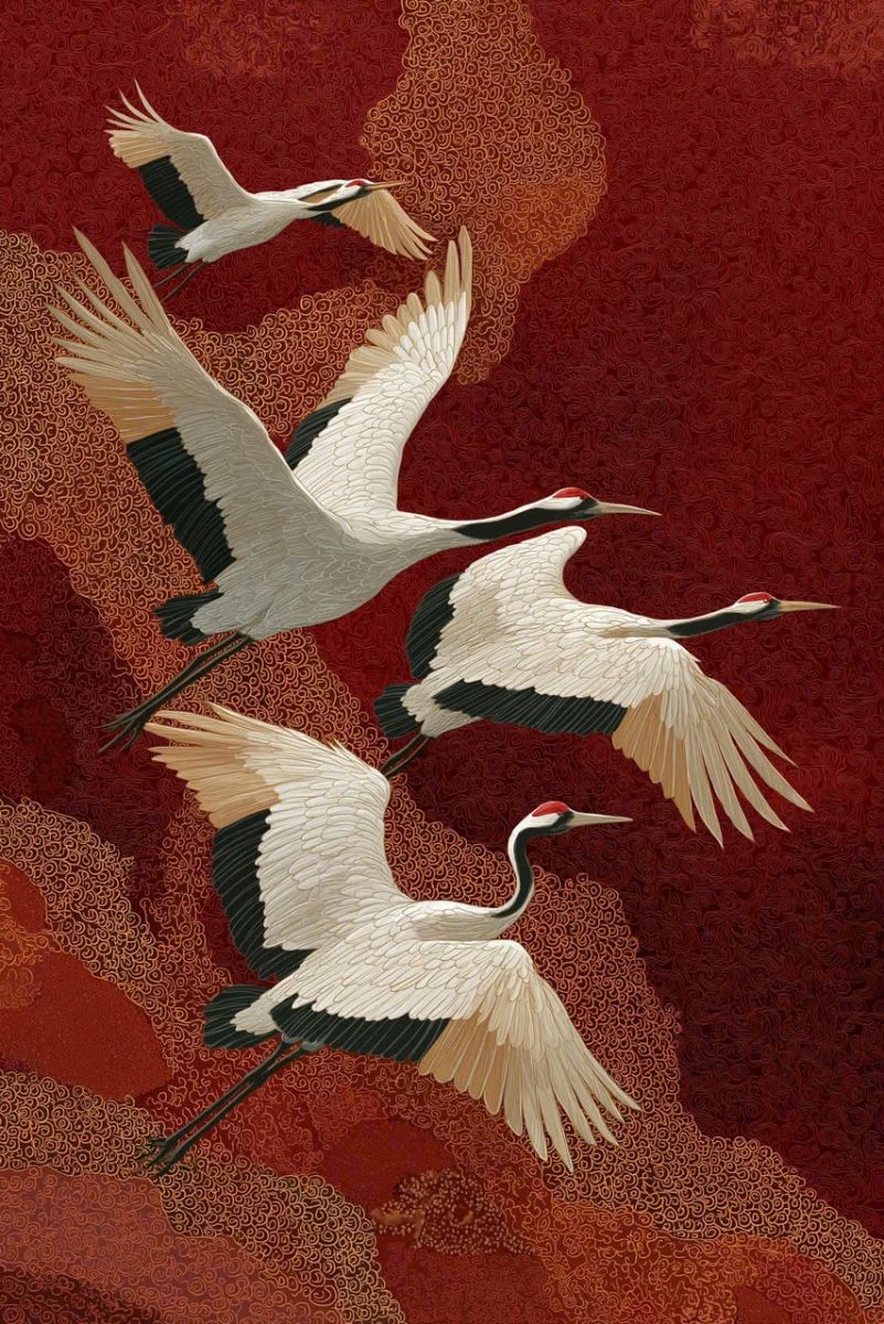 Bức tranh dán tường đôi chim đậu trên nhành đào với tone màu xanh ngọc chủ đạo, có hình ảnh hai chú chim màu lông đen trắng đang đậu trên một cành đào đỏ. Cành đào to màu nâu với những bông hoa đỏ rực đang nở rộ, phía sau là những ngọn núi cao trùng trùng, điệp điệp xếp chồng lên nhau ẩn hiện mờ ảo, xa xa là ánh trăng vằng vặc soi sáng từng cảnh vật, bên dưới là mặc hồ lấp lánh với những tia sáng của ánh trăng. Đề tài tranh dán tường indochine mang đến vẻ đẹp thẩm mỹ sang trọng và cao cấp cho không gian trang trí.