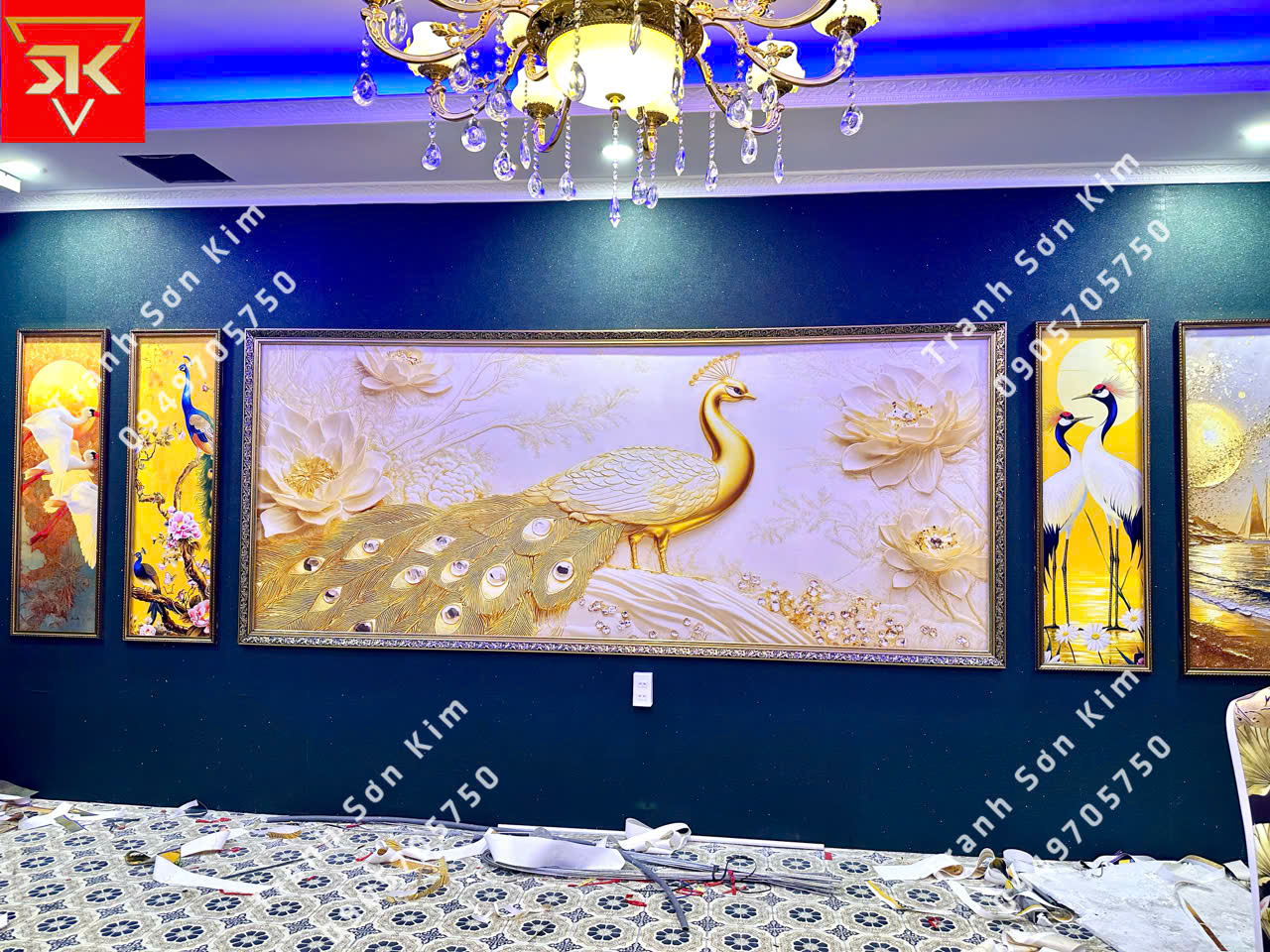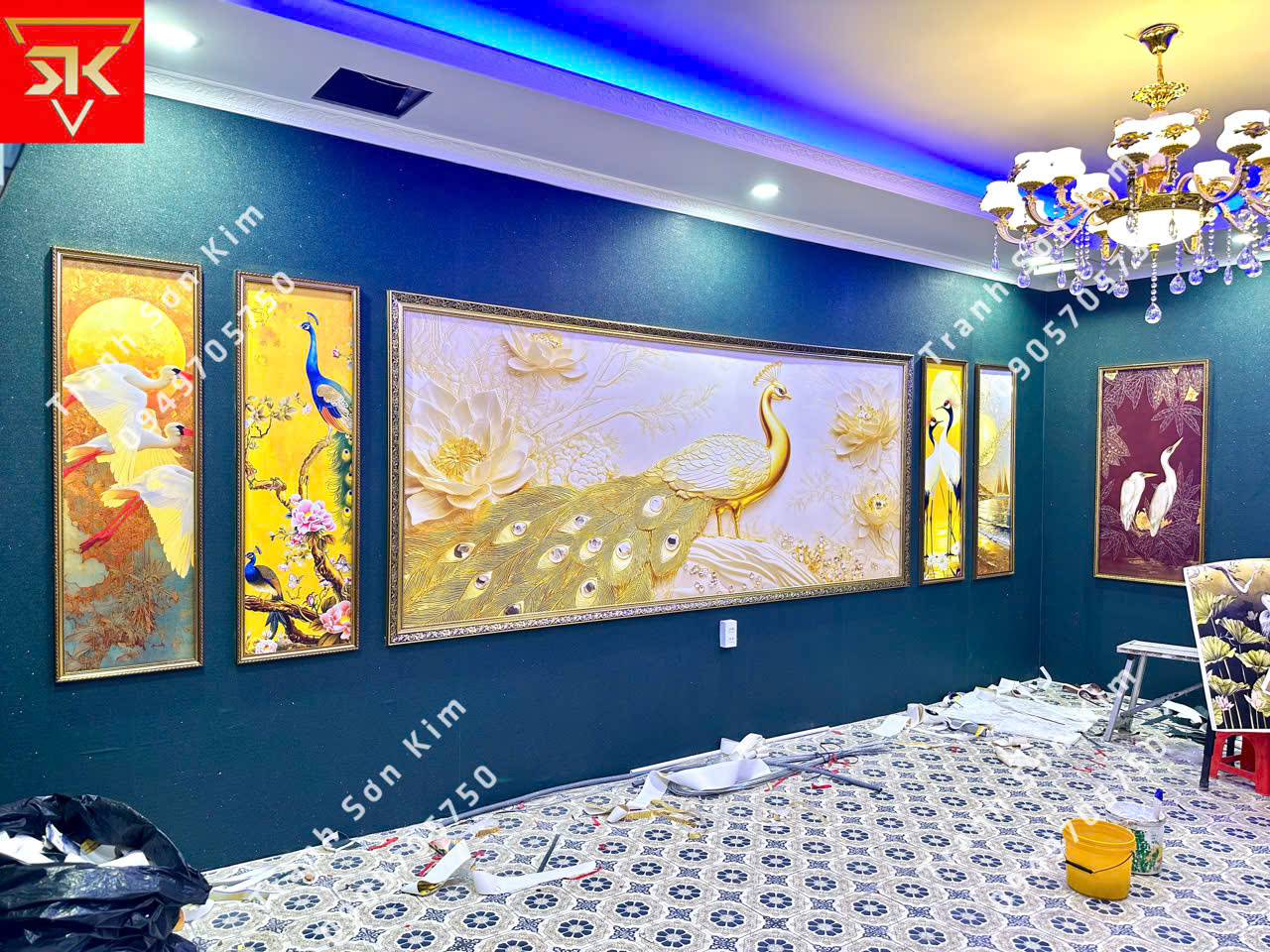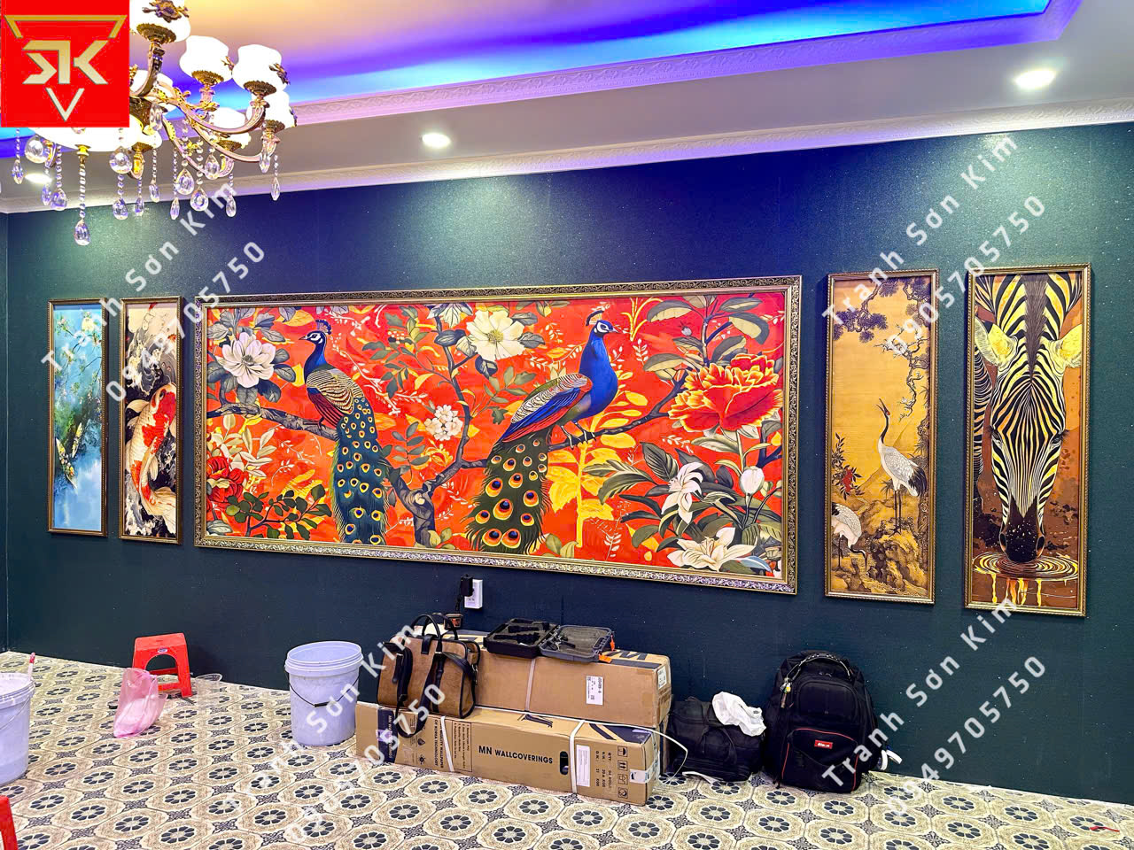 Thi công tranh dán tường indochine mẫu chim công cho phòng VIP nhà hàng