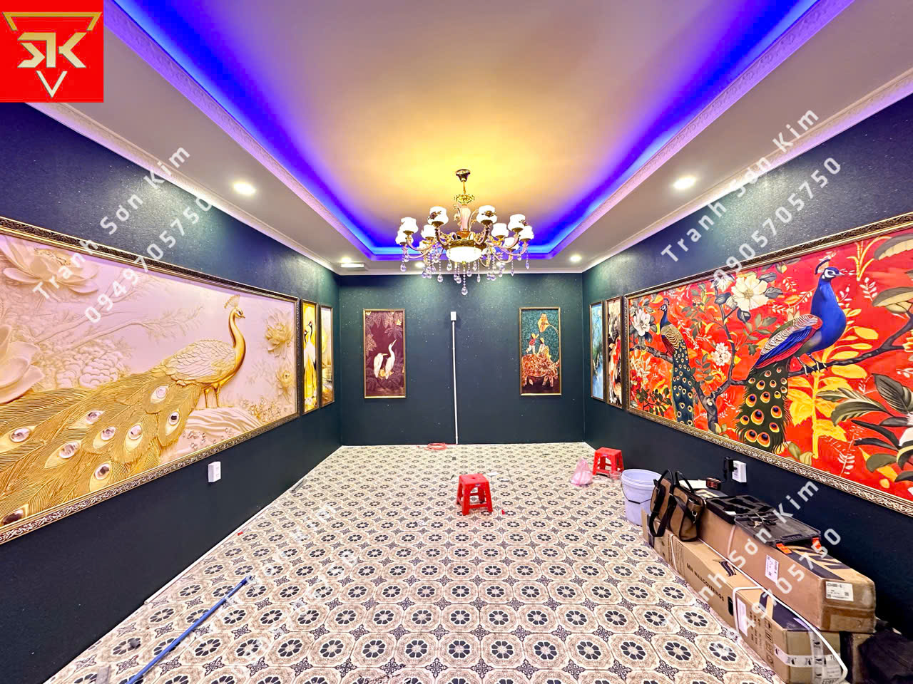 Không gian phòng VIP trong nhà hàng được thổi hồn bằng tranh dán tường phong cách Indochine, nổi bật nhất là bức chim công rực rỡ trên nền hoa lá tượng trưng cho sự thịnh vượng, sang trọng và cao quý. Các mảng tranh phụ họa như cá chép, chim hạc, ngựa vằn tạo nên sự đa dạng nghệ thuật, vừa cổ điển vừa hiện đại. Kết hợp cùng ánh đèn chùm pha lê lộng lẫy và trần thạch cao chiếu sáng xanh tím, căn phòng mang đến một bầu không khí ấm cúng, sang trọng và đầy tính nghệ thuật – xứng đáng là điểm nhấn đẳng cấp cho phòng VIP nhà hàng.