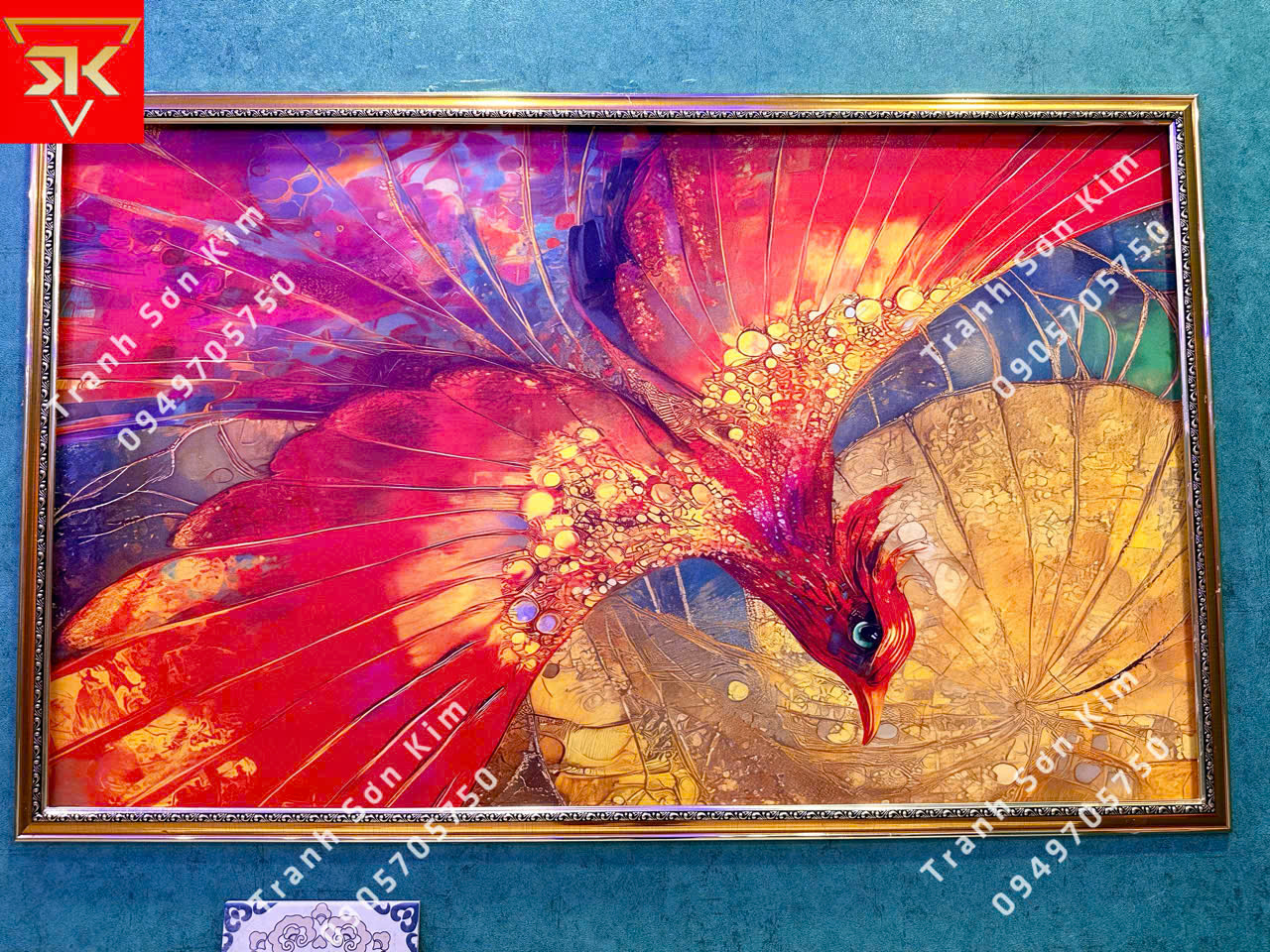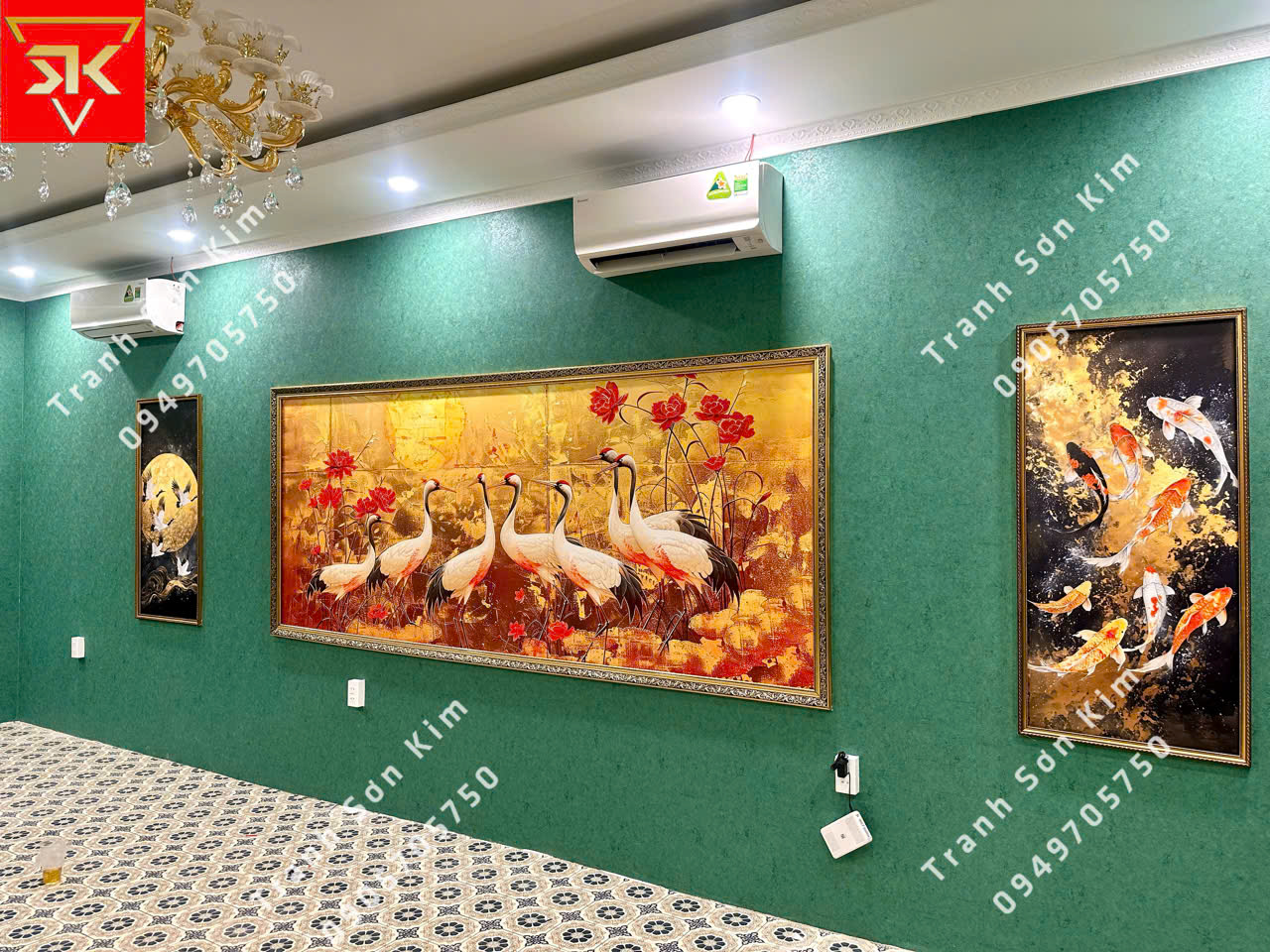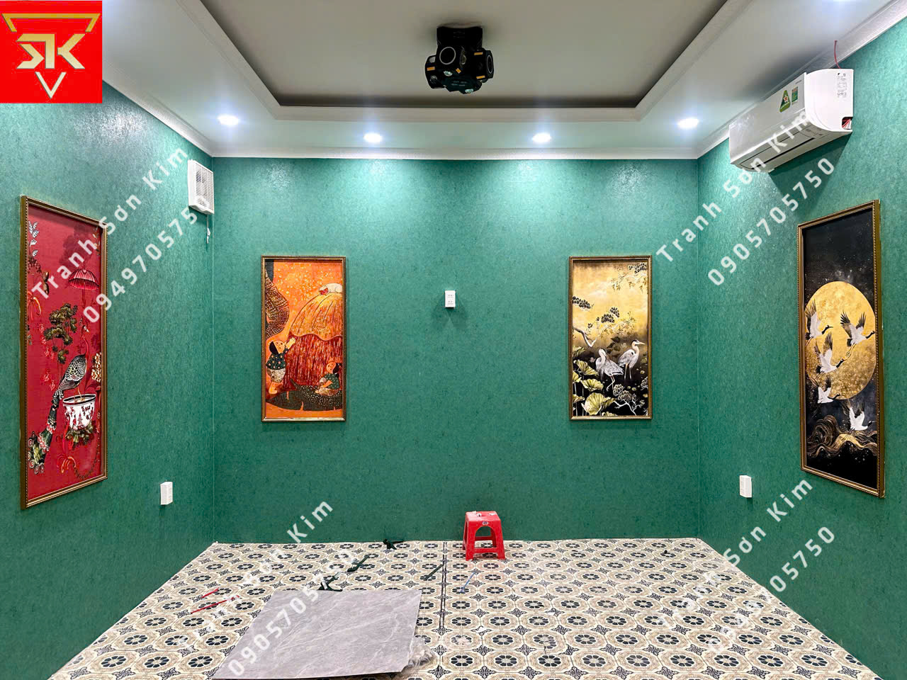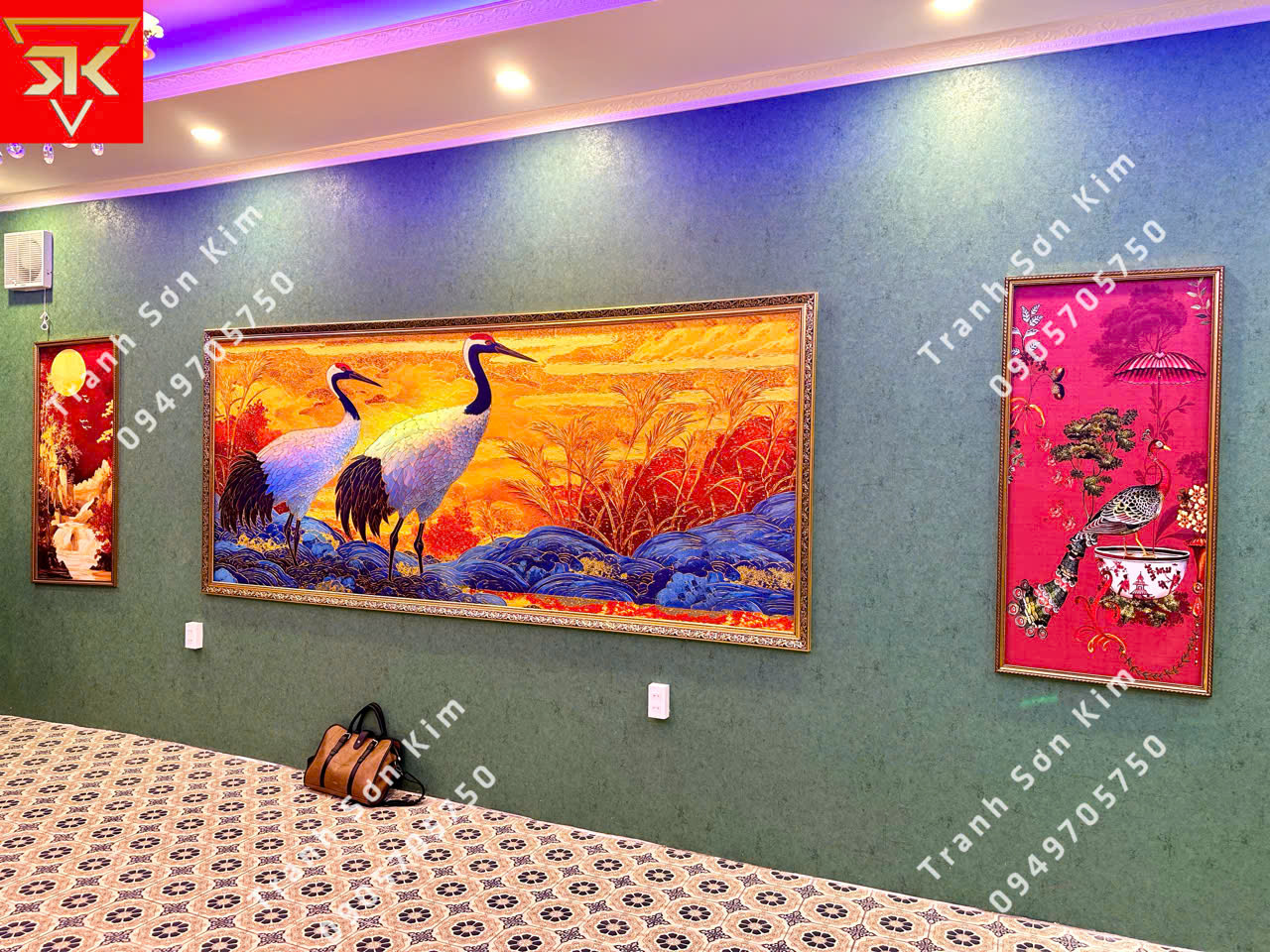 Không gian phòng VIP trở thành điểm nhấn sang trọng và tinh tế khi khoác lên mình bộ tranh dán tường Indochine nền xanh. Hình ảnh chim hạc, chim công uyển chuyển giữa hoa lá. Sắc đỏ – vàng – xanh của tranh bừng sáng, gợi nên sự quý phái, thịnh vượng và đẳng cấp. Kết hợp cùng ánh đèn chùm pha lê lung linh và trần thạch cao viền ánh sáng hiện đại, căn phòng trở thành một không gian vừa ấm cúng, huyền ảo, vừa mang đậm chất nghệ thuật Đông Dương.