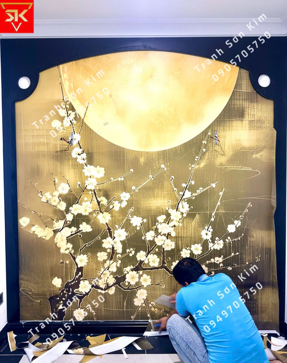Thi công tranh dán tường indochine đôi chim đậu trên cành hoa dưới ánh trăng cho phòng khách