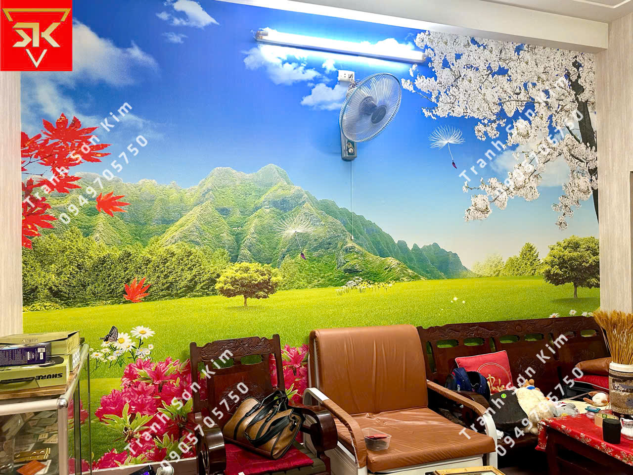 Thi công tranh dán tường phong cảnh đồi núi cho phòng khách