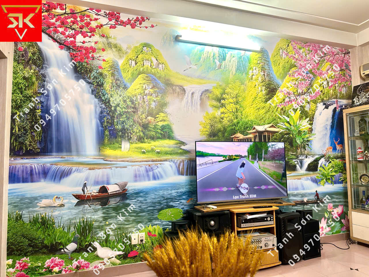 Thi công tranh dán tường phong cảnh thác nước cho phòng khách
