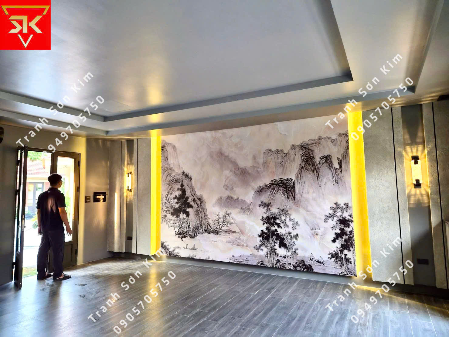 Thi công tranh dán tường sơn thủy hữu tình cho phòng khách