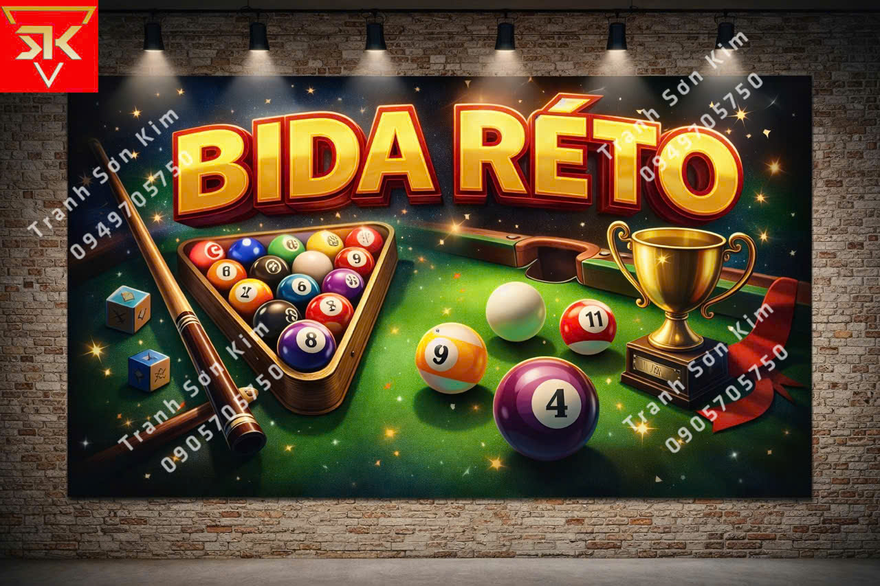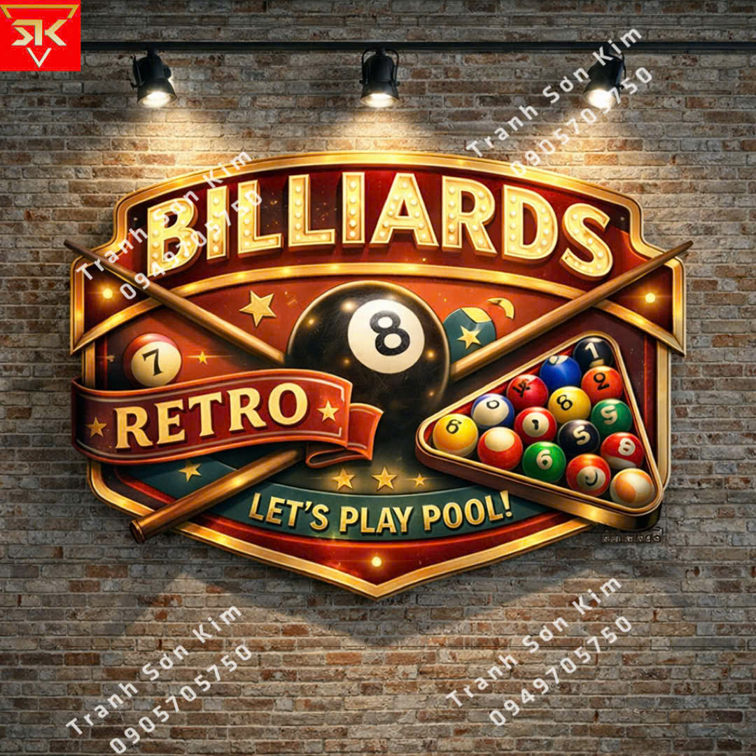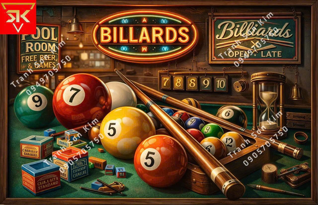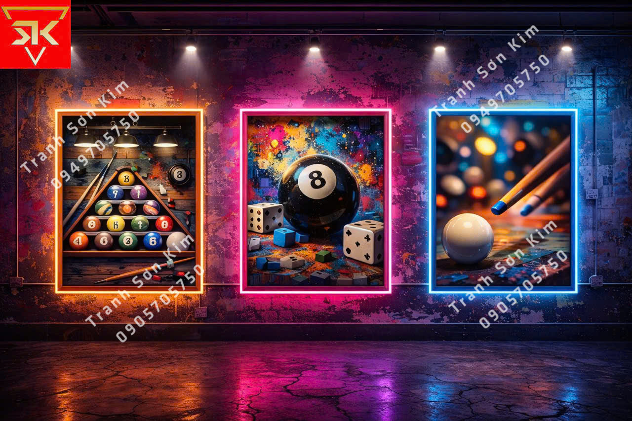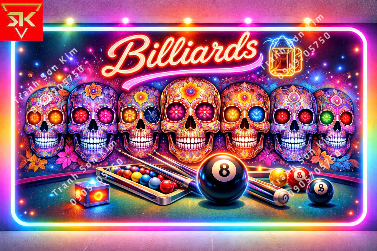 Sơn Kim nhận thiết kế tranh bida theo yêu cầu khách hàng, phong cách độc - lạ – không trùng mẫu. Tranh in công nghệ cao, hiệu ứng 3D nổi khối sắc nét, màu bền đẹp theo thời gian. Nhận in mọi kích thước theo không gian quán, từ logo đến vách lớn.