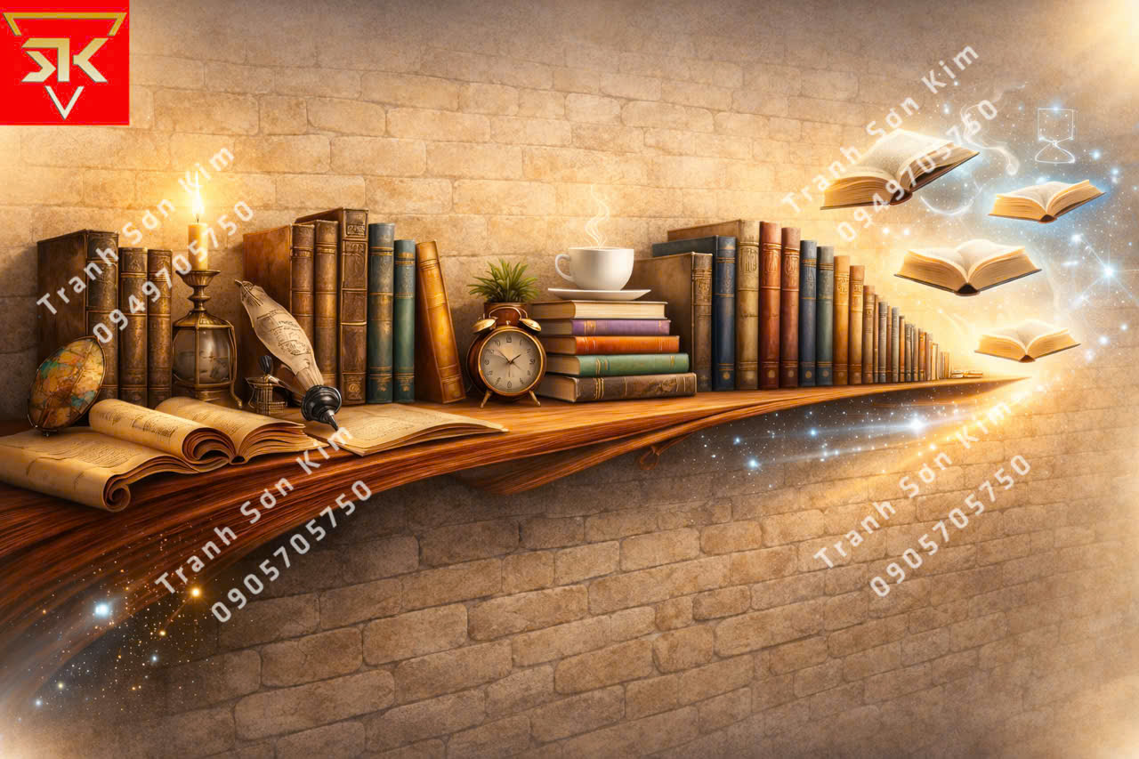 thi công tranh dán tường 3D kệ sách cho quán cafe phong cách Vintage