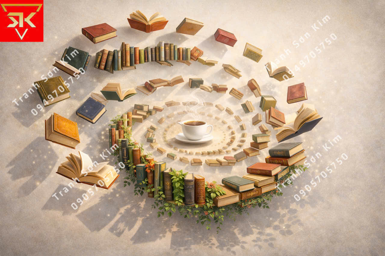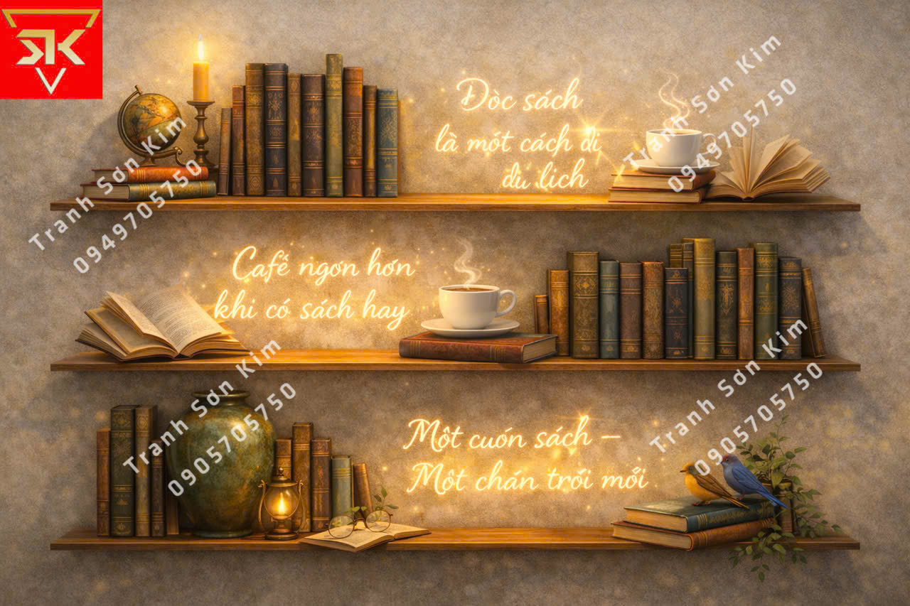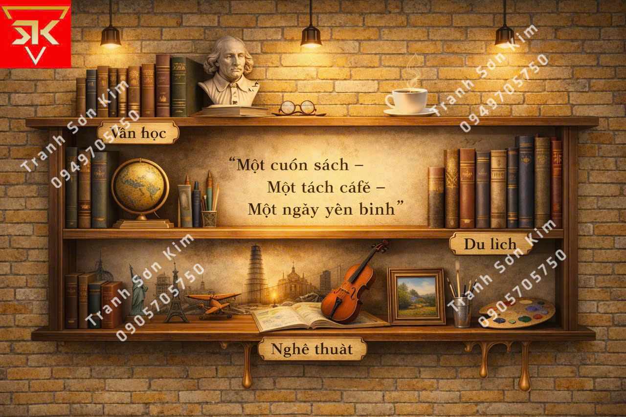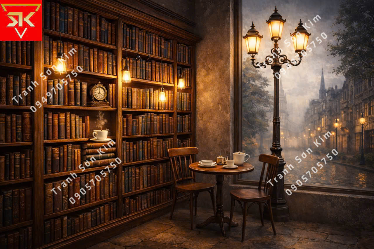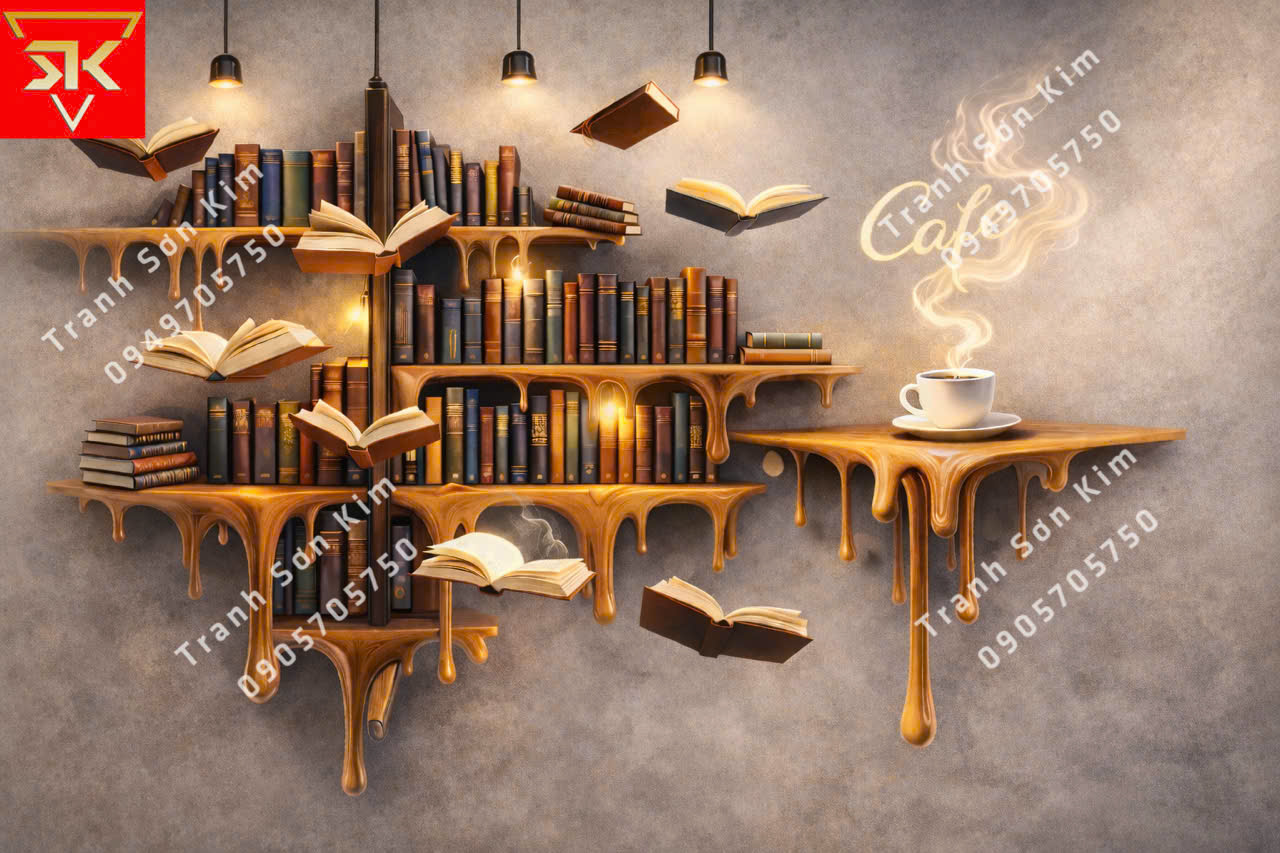 Tranh dán tường kệ sách - bí quyết biến quán cà phê thành góc chill trí tuệ