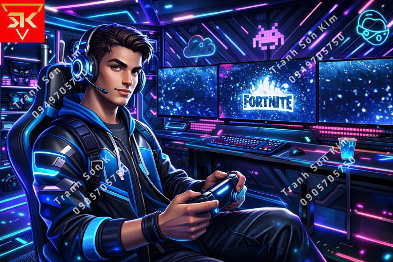 Mẫu tranh dán tường mang phong cách gaming hiện đại, cực kỳ phù hợp cho các không gian phòng game, phòng livestream hoặc phòng cá nhân dành cho game thủ.