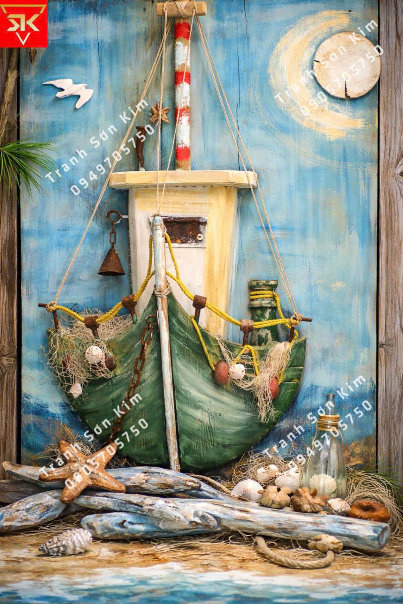 Tranh dán tường mẫu thuyền ghe, sóng nước, ốc ngon
