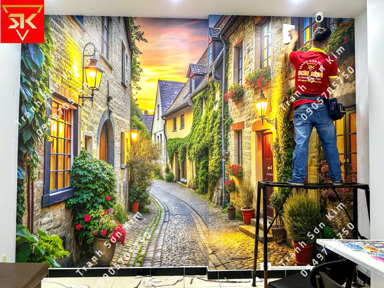 Thi công tranh dán tường con đường thành phố châu âu cho quán cafe
