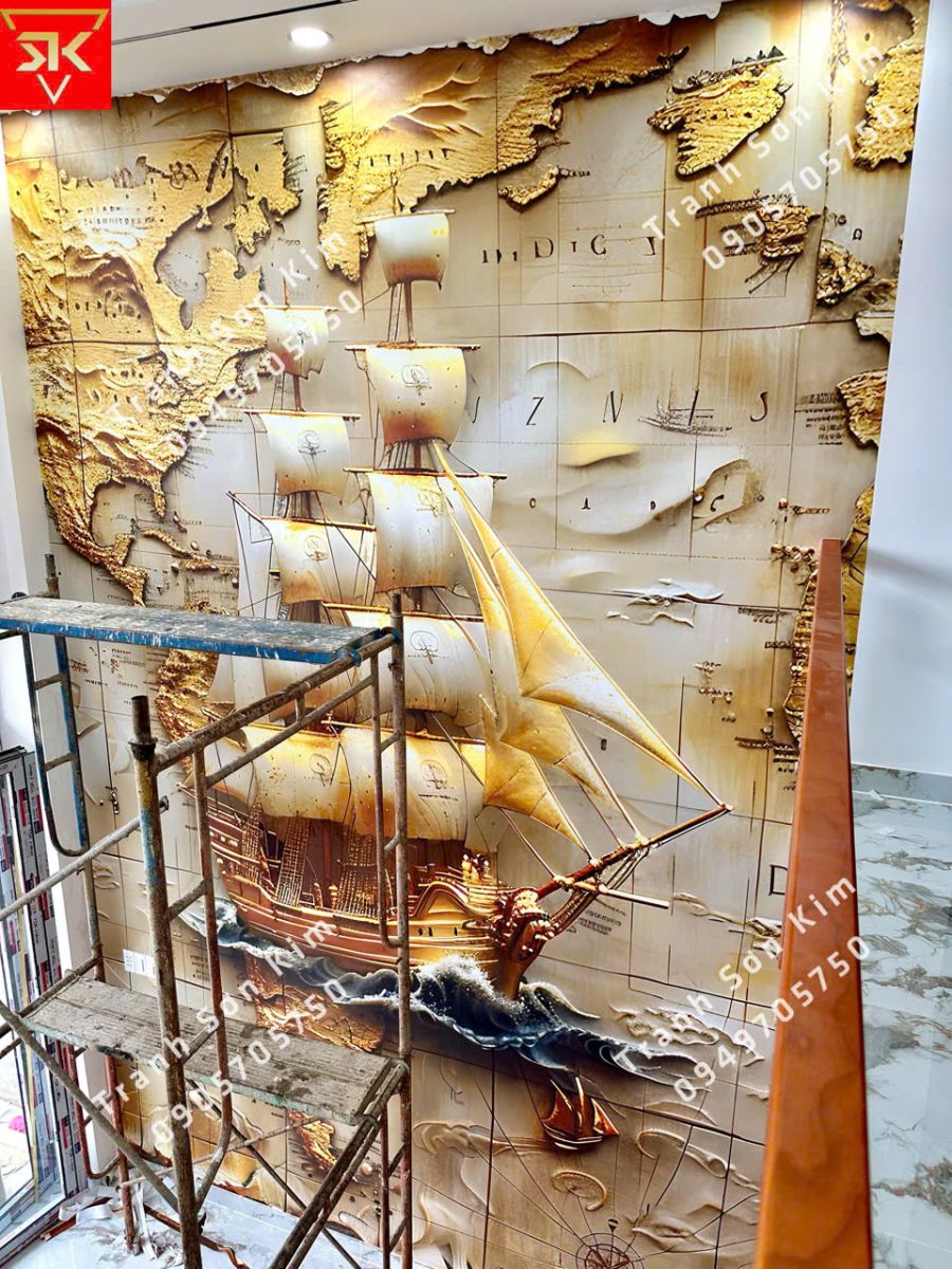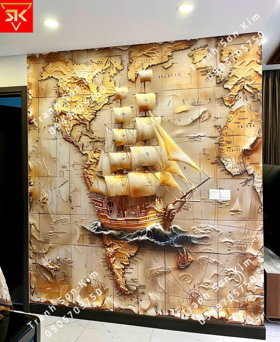 Bức tranh thuyền buồm phong thủy sang trọng, nổi bật trên nền bản đồ cổ, mang ý nghĩa mọi hành trình đều nhẹ nhàng và hanh thông. Từng cánh buồm căng gió như mở ra chuyến hải trình mới – nơi tài lộc theo sóng mà vào, công danh sự nghiệp vững vàng tiến bước.