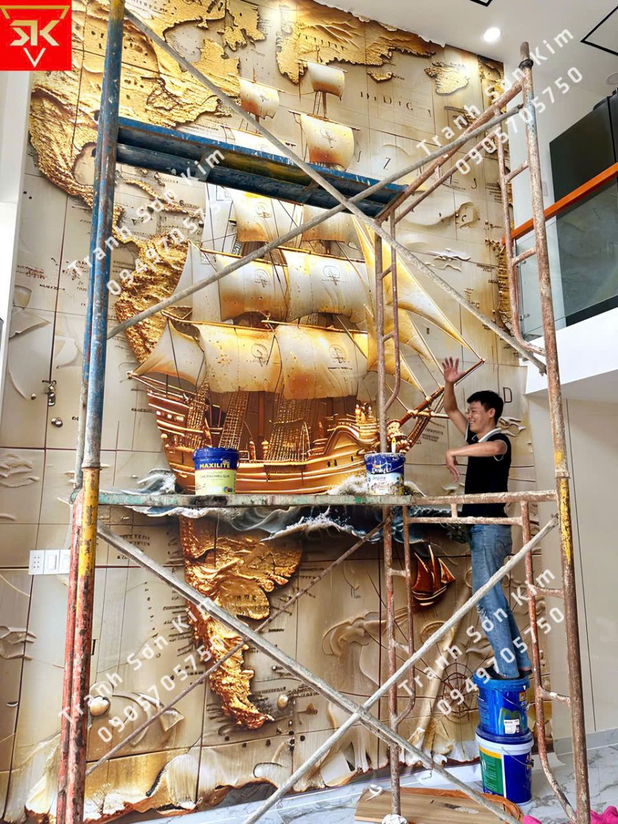 Thi công tranh dán tường thuận buồm xuôi gió khổ lớn phòng khách