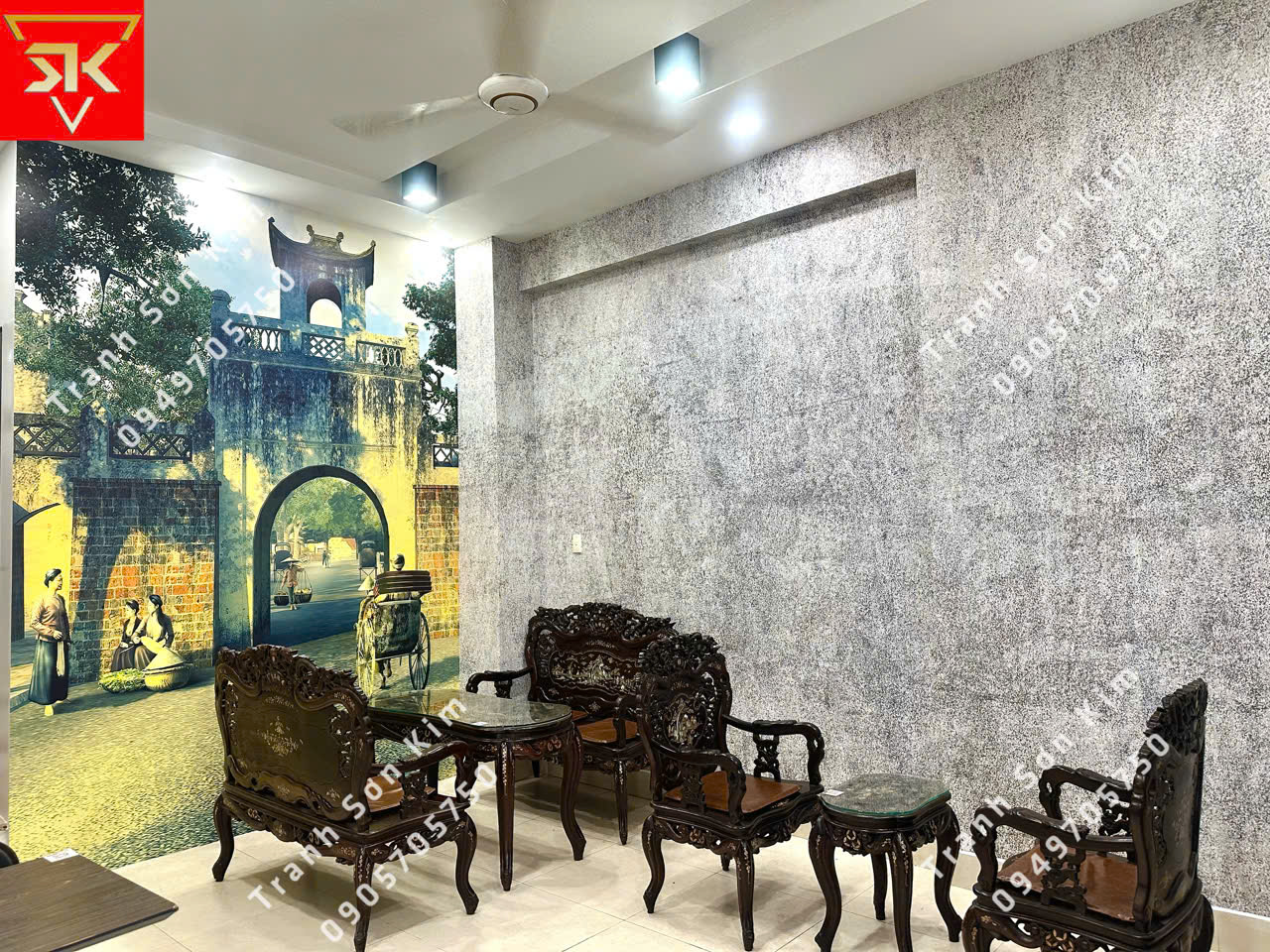 Không gian phòng khách như đưa ta quay về quá khứ với hình ảnh tranh Ô Quan Chưởng trắng đen, tái hiện nếp sống xưa mộc mạc và bình dị. Bên cạnh đó, tranh nền xám hiệu ứng xi măng lại mang hơi thở hiện đại, tạo sự cân bằng và làm nổi bật điểm nhấn chính. Sự kết hợp này mang đến một phòng khách vừa hoài niệm, vừa sang trọng, nơi quá khứ và hiện tại giao thoa đầy ấn tượng.