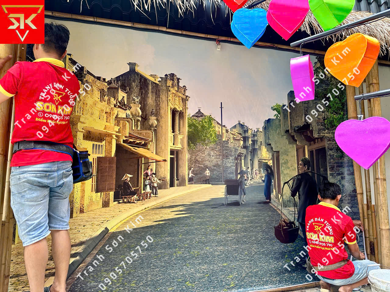 Thi công tranh dán tường phố cổ Hà Nội trắng đen cho quán bia hơi