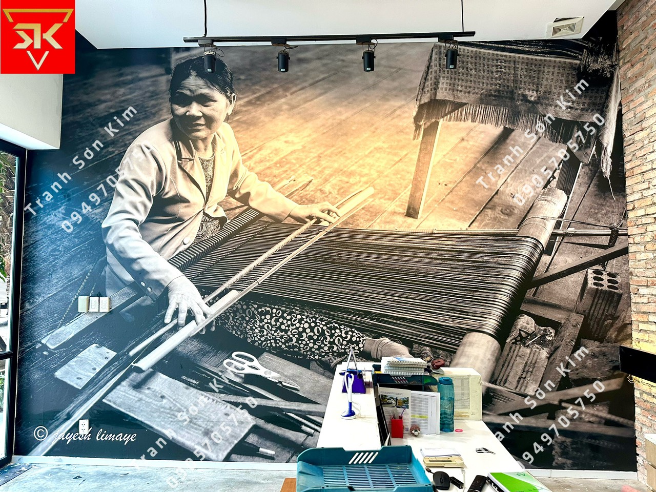 Bức tranh dán tường trắng đen được chụp người phụ nữ ngồi dệt lụa thủ công, cảnh vật xung quanh gợi lên sự hoài cổ, mộc mạc và truyền thống lâu đời của nghề dệt lụa Việt Nam ta.