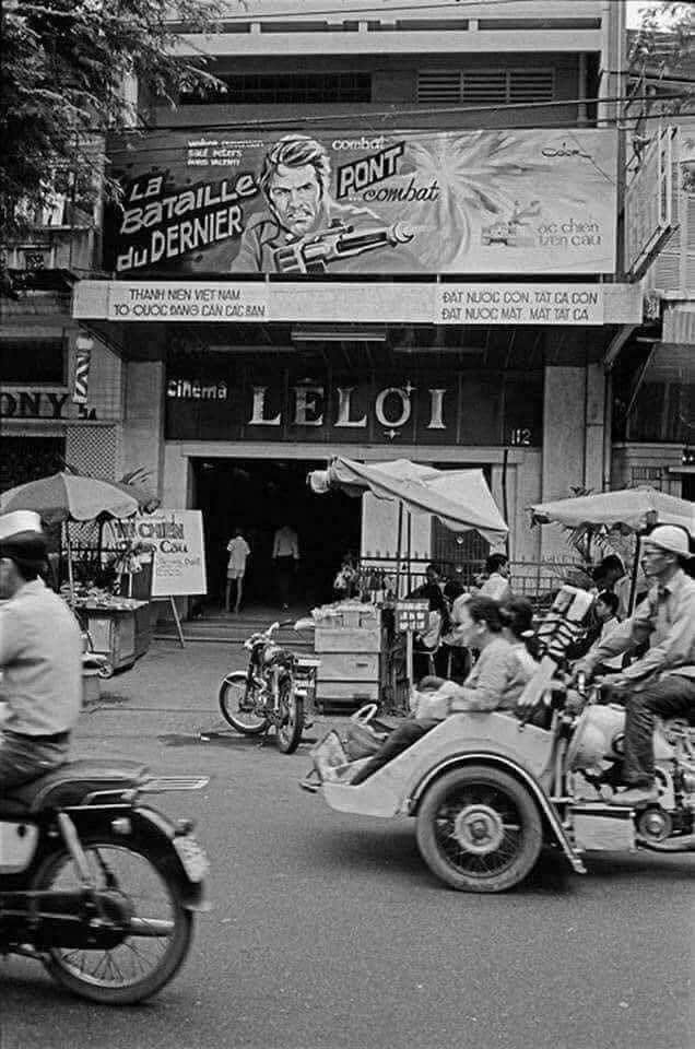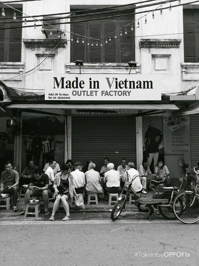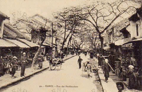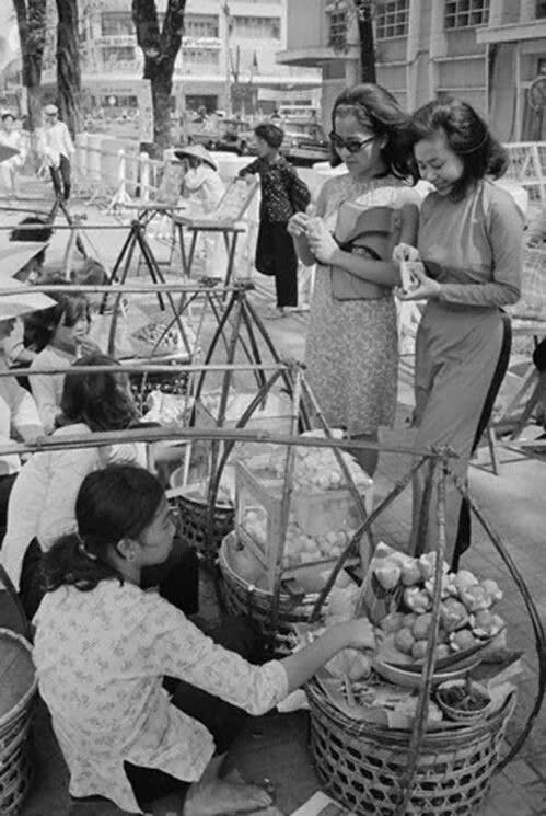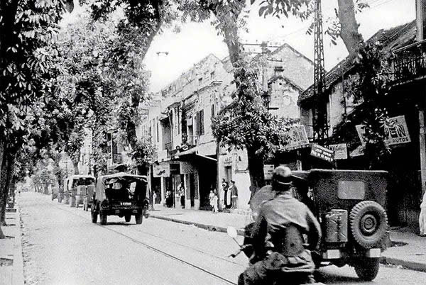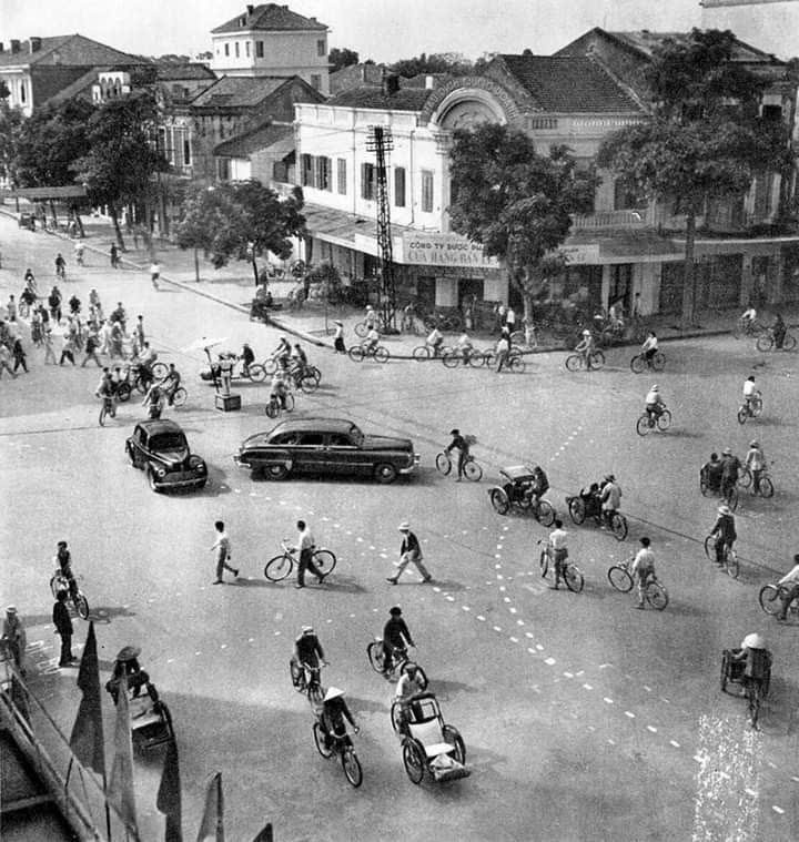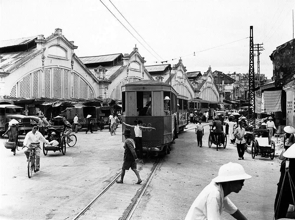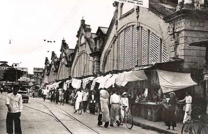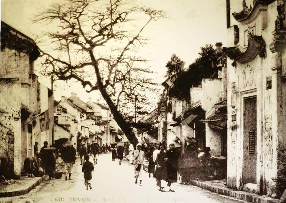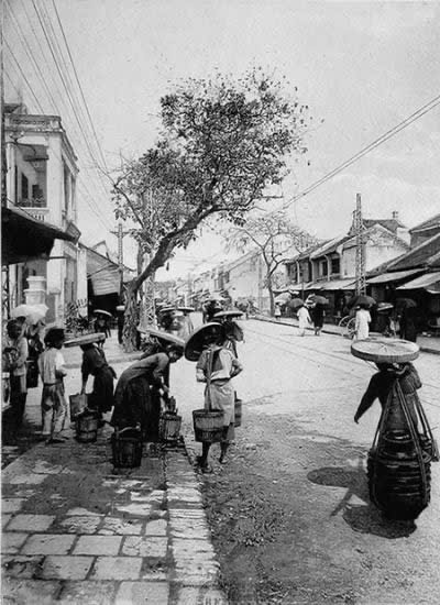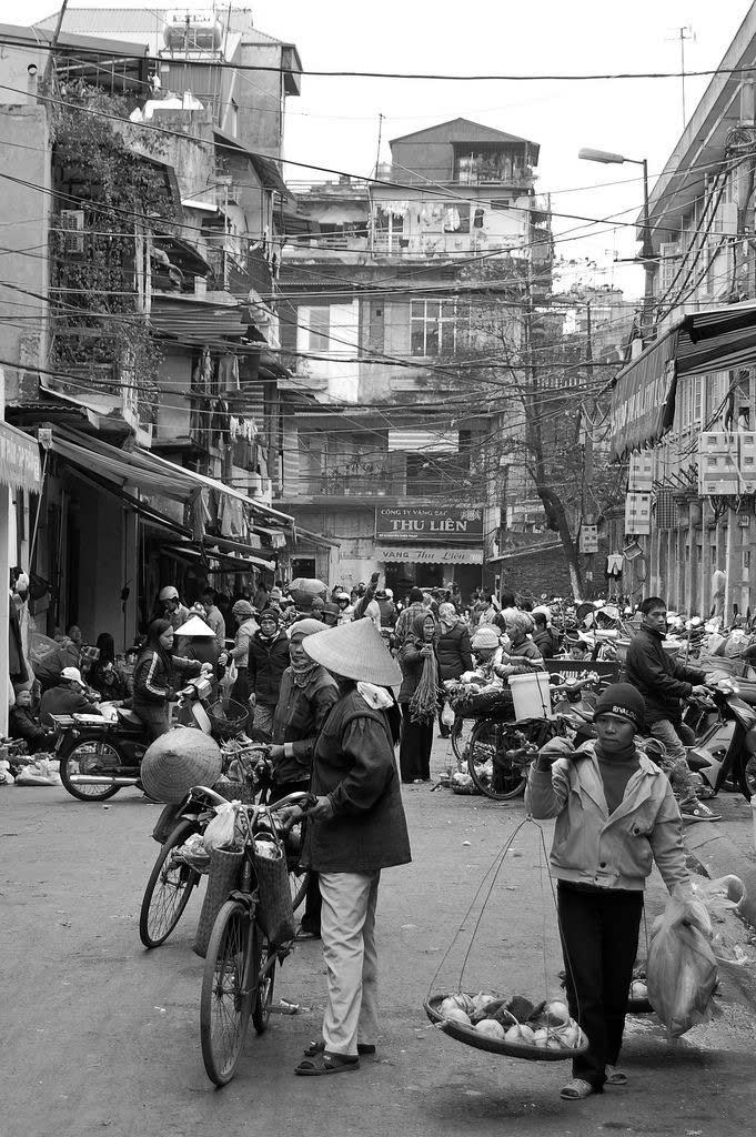 Tranh dán tường trắng đen tái hiện một góc phố Việt Nam xưa với nét mộc mạc, bình dị nhưng đầy sức sống. Dọc con đường lát gạch và đất, những người phụ nữ gánh hàng rong, đội nón lá, tất bật mưu sinh. Bên kia đường là những dãy nhà ngói san sát, mái hiên buông thấp, mang đậm kiến trúc truyền thống xen lẫn dấu ấn thuộc địa.