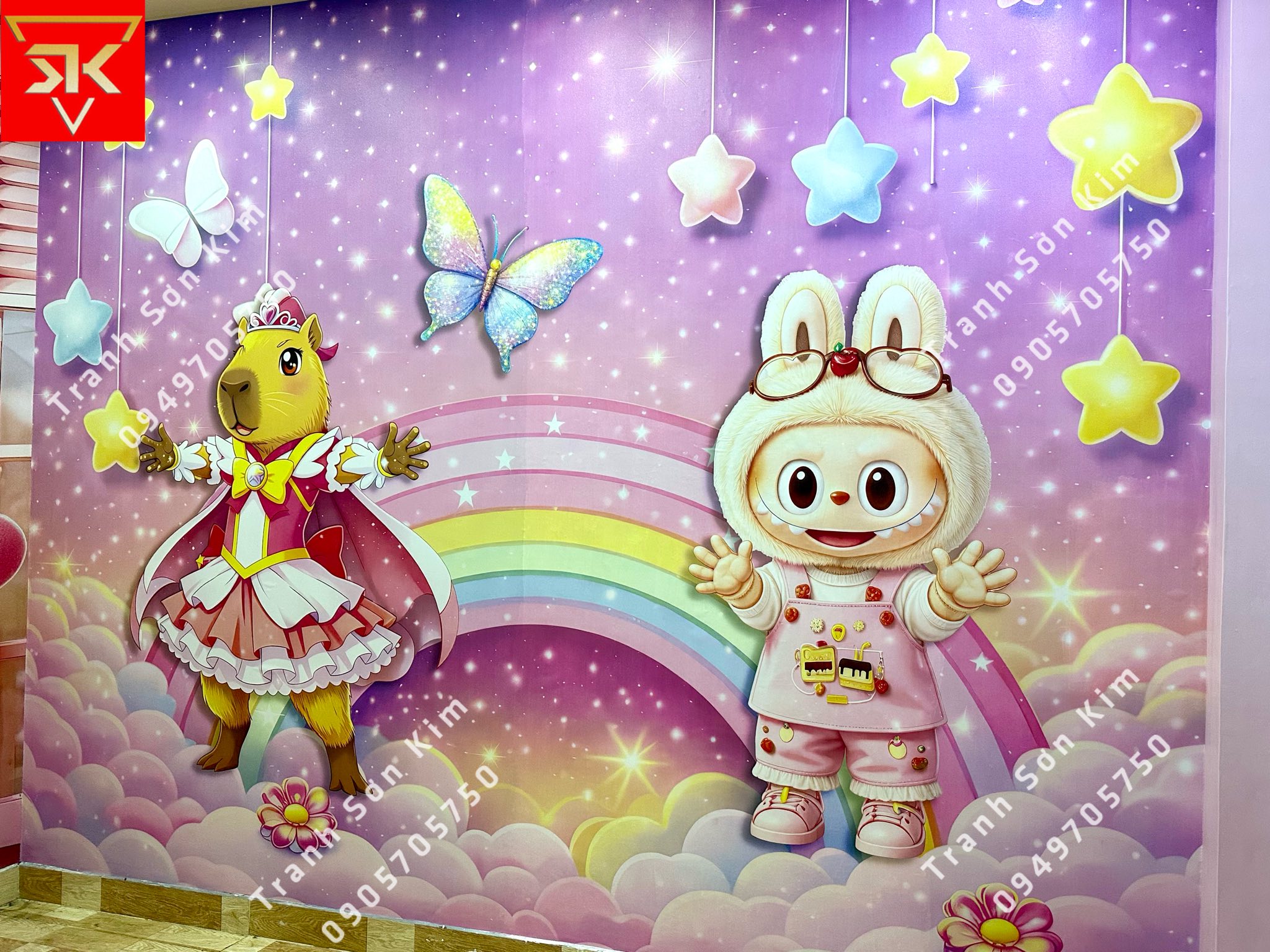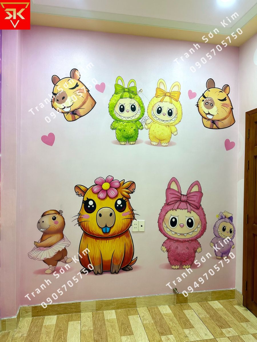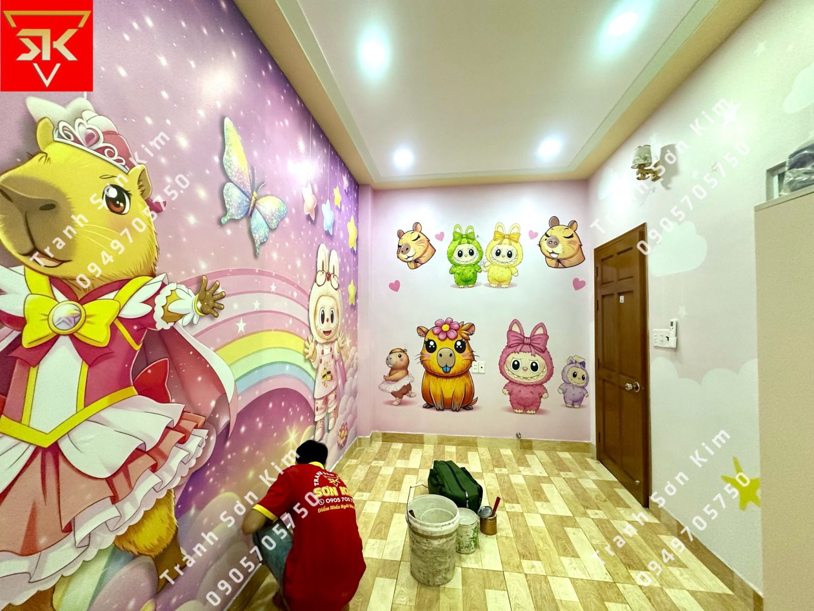 Thi công tranh dán tường capybara và labubu cho phòng bé gái